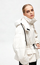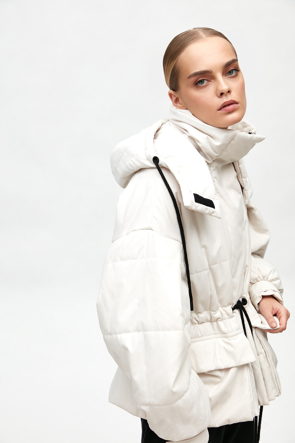 A jacket with a high gate and a hood in the backstage. Pavers, a secret lightning fastener. Badge on the belt for fixation.