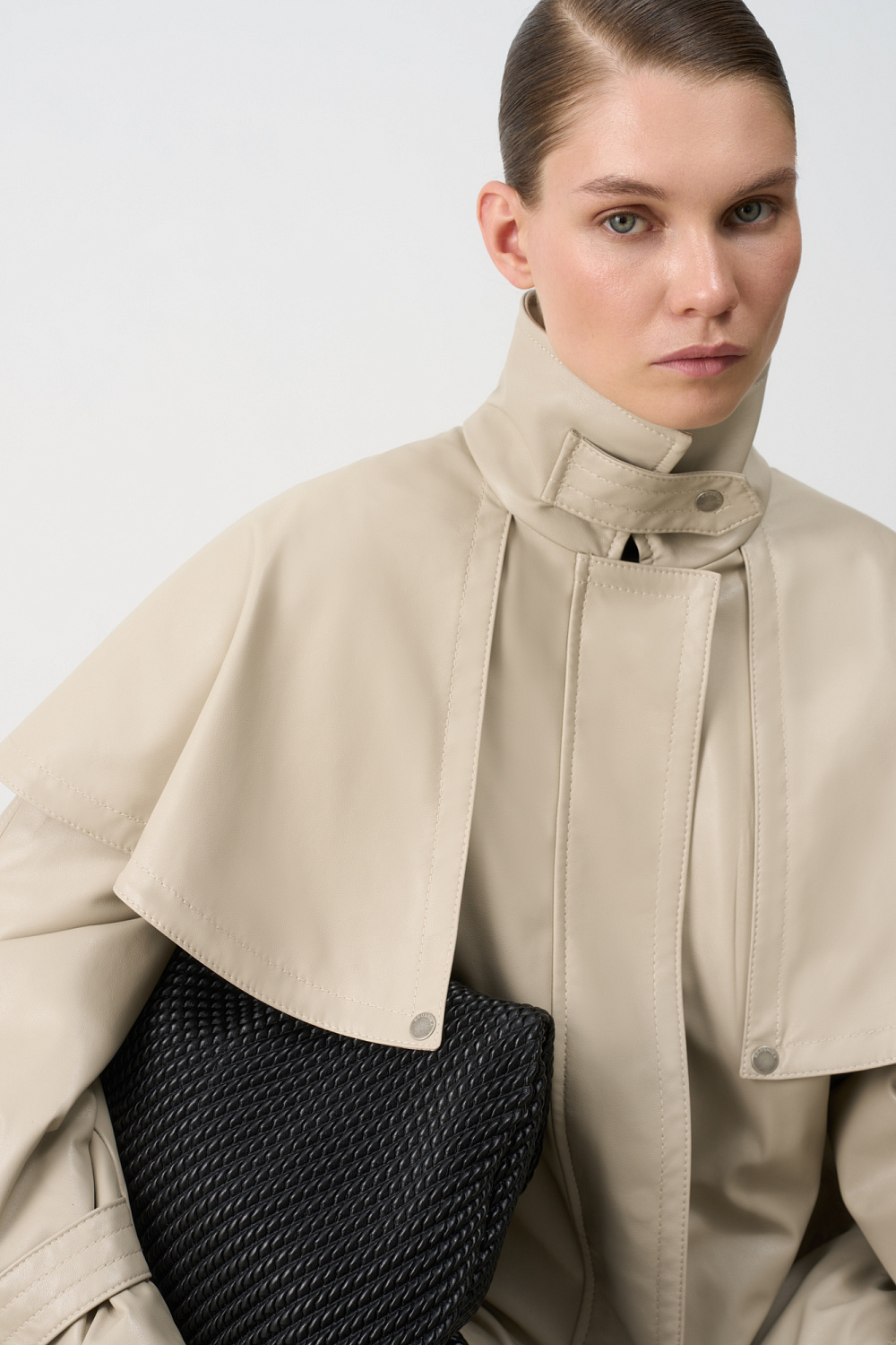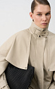 Jacket with asymmetrical flap. The model has a loose silhouette with a stand-up collar, side pockets and patches on the cuffs. Belt to match the product. Lined.