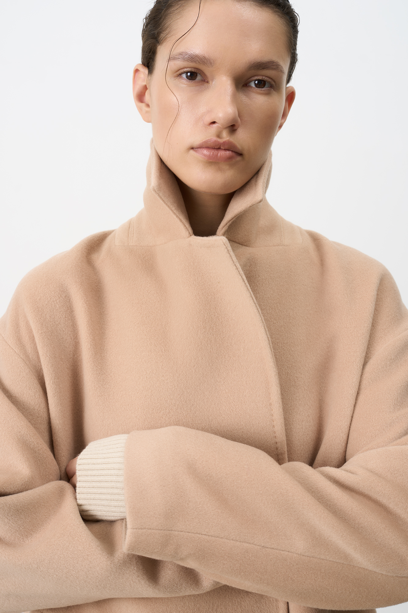 Double-breasted virgin wool coat with a turn-down collar and long sleeves. Side pockets, back vent and tonal lining. Button closure.