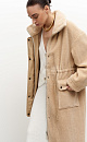 Faux fur coat with a dropped shoulders, patch pockets and a drawstring at the waist. Featuring loose-fit silhouette, stand collar, zipper and button closure.