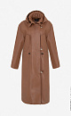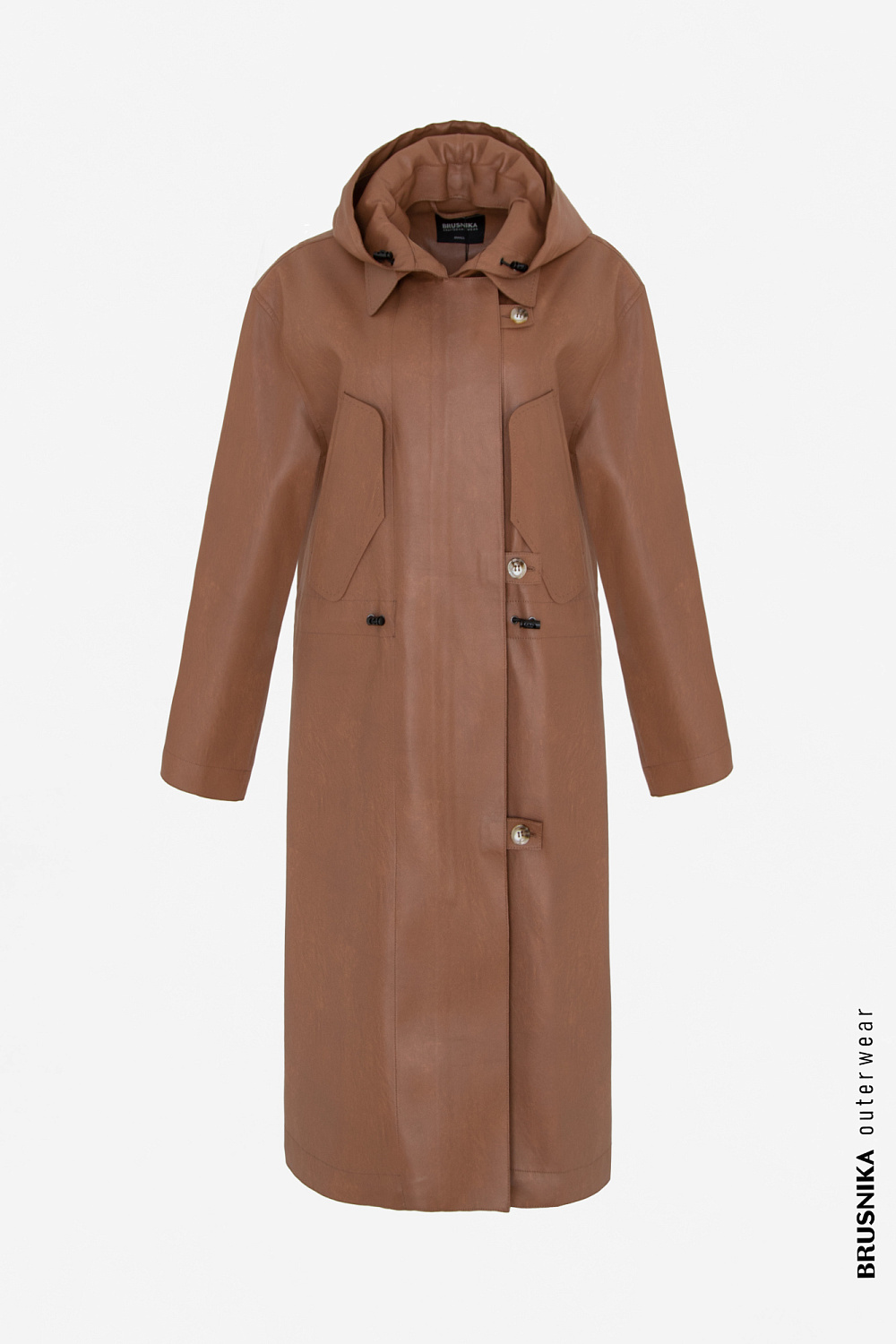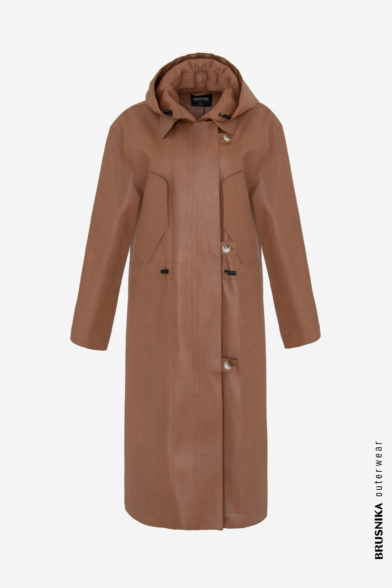 Eco -leather ramp of medium length with a waist on the waist and a hood on the buttons.