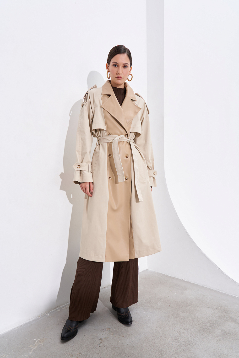 The raincoat is made of dense textiles with elements of eco-leather. A model of a direct silhouette with a belt, a folk collar, a double -breasted button on buttons, side pockets.