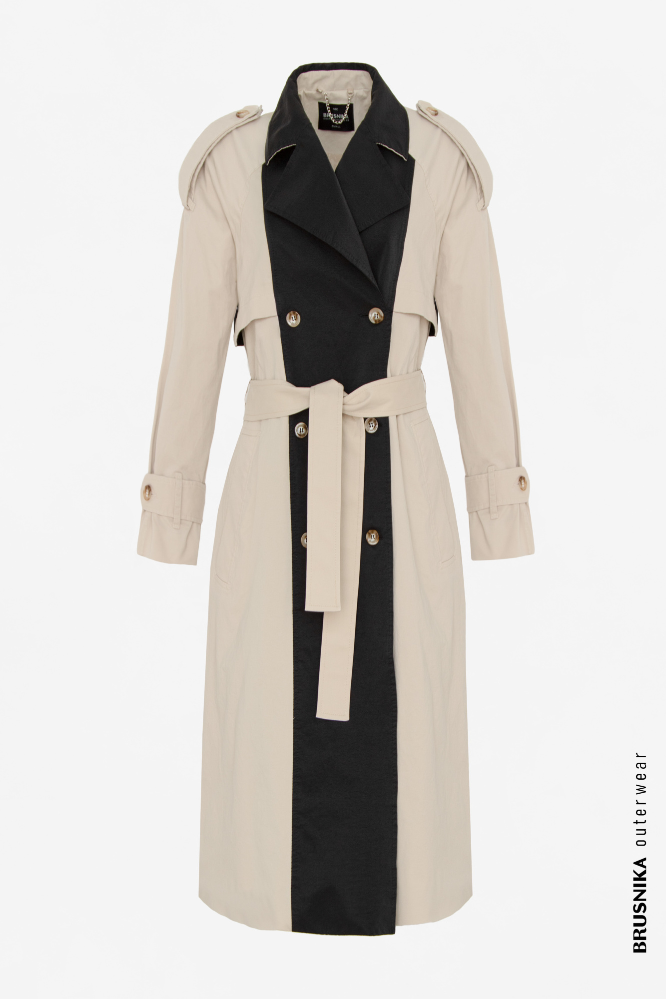 Light classic trench coat with a black insert on the smell. Asymmetric departure coquette, a folk collar, a pato on the cuffs and a wide belt of the main material.