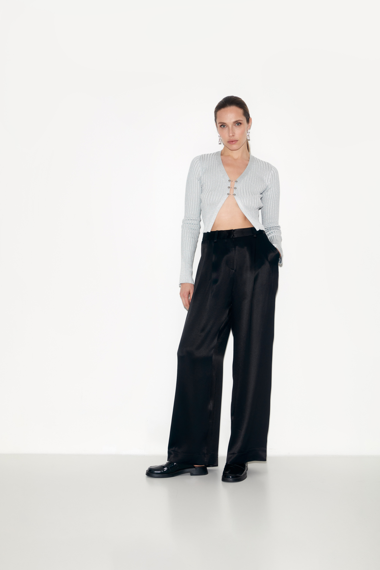 Wide-leg satin trousers made of 100% viscose. High rise model. Side pockets and concealed zip and button closure.