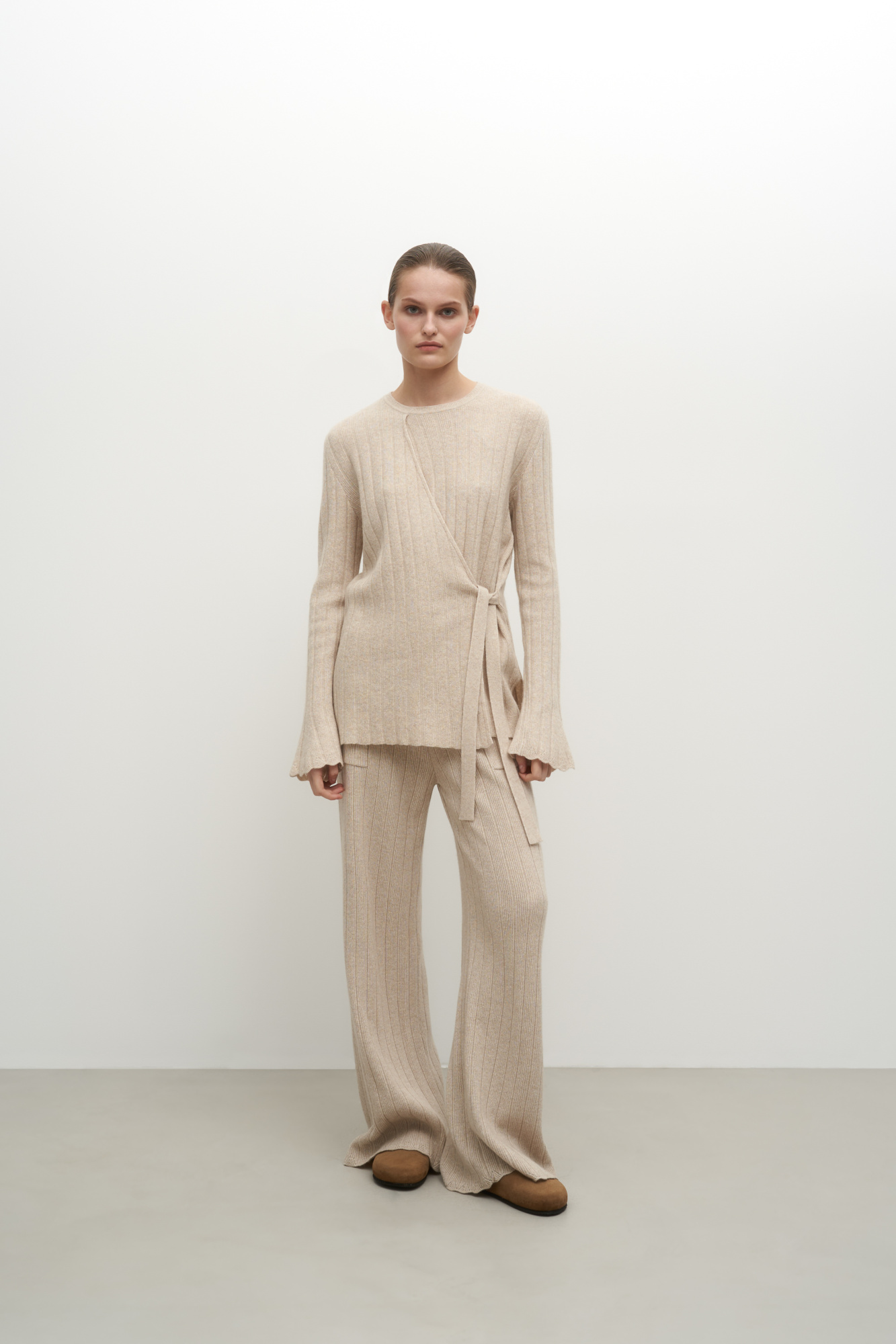 Knitted wool trousers with the addition of cashmere. Model of a free silhouette with an average landing. Elastic belt on an adjustable backstage and lateral pockets. You can finish the image with a jumper.
