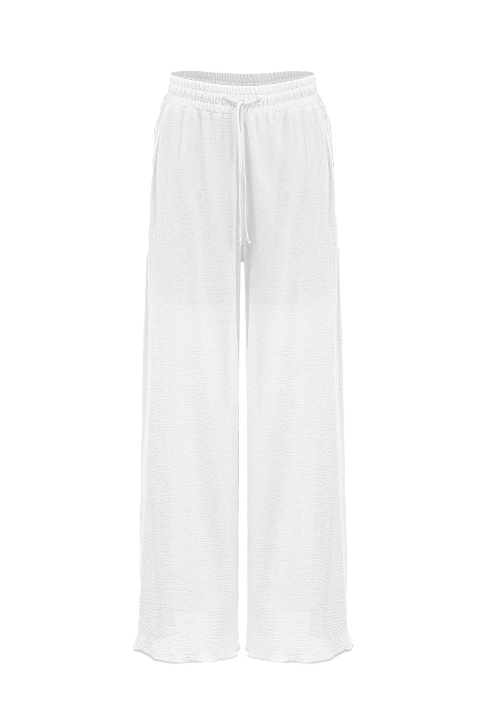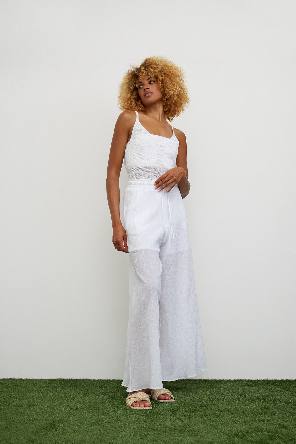 Wide-leg trousers with drawstring made of 100% cotton. Side pockets.