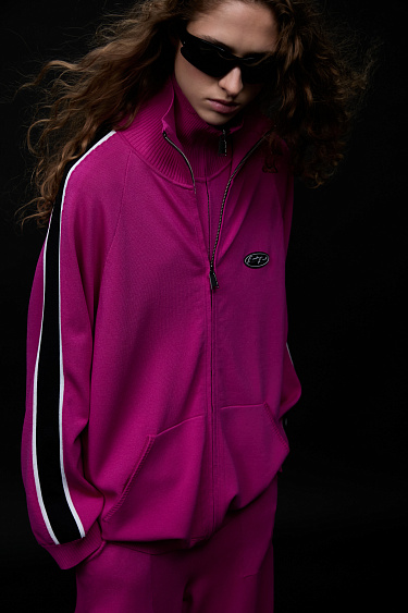 Wide trousers made of viscose with two-tone stripes and an inscription at the bottom. Elastic waistband with drawstring and side pockets.