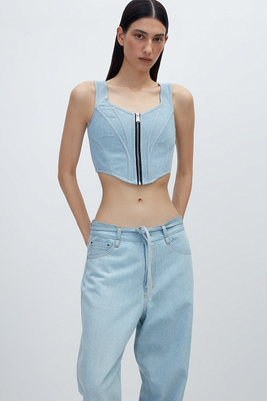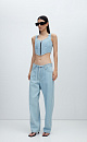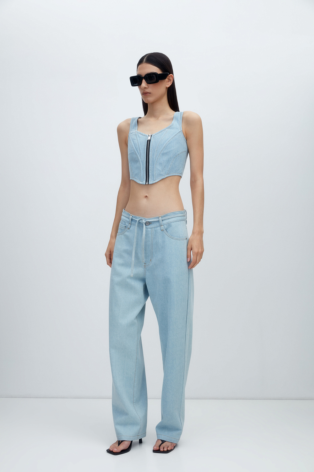 Wide leg jeans in 100% cotton denim with a branded label on the back and belt.
