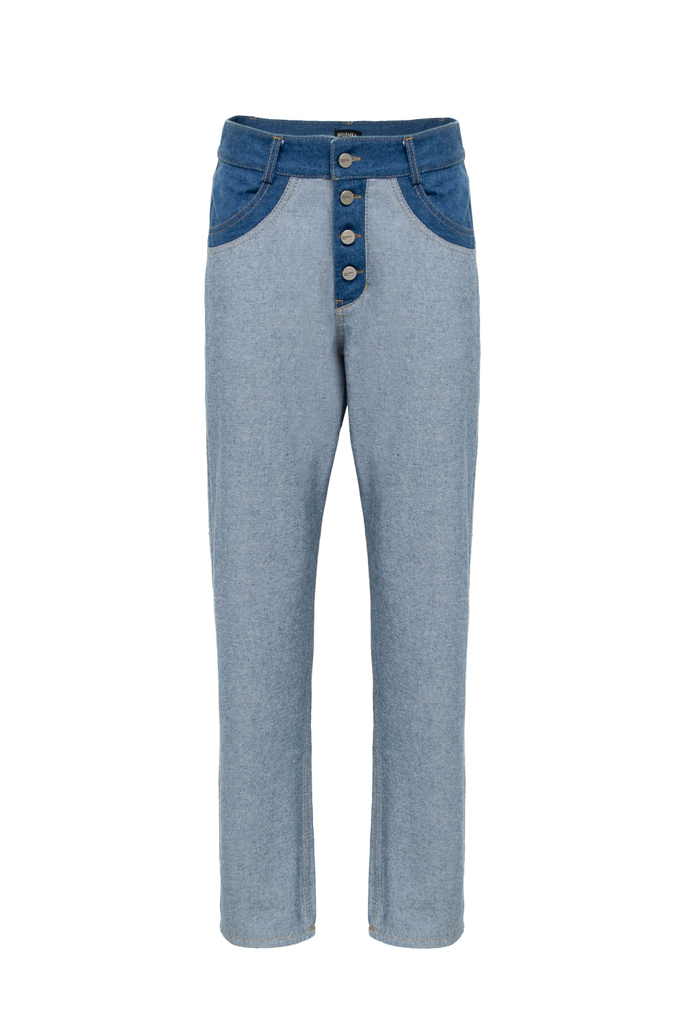 100% cotton inside-out straight leg jeans with button closure. You can complement the look with a same style jacket.