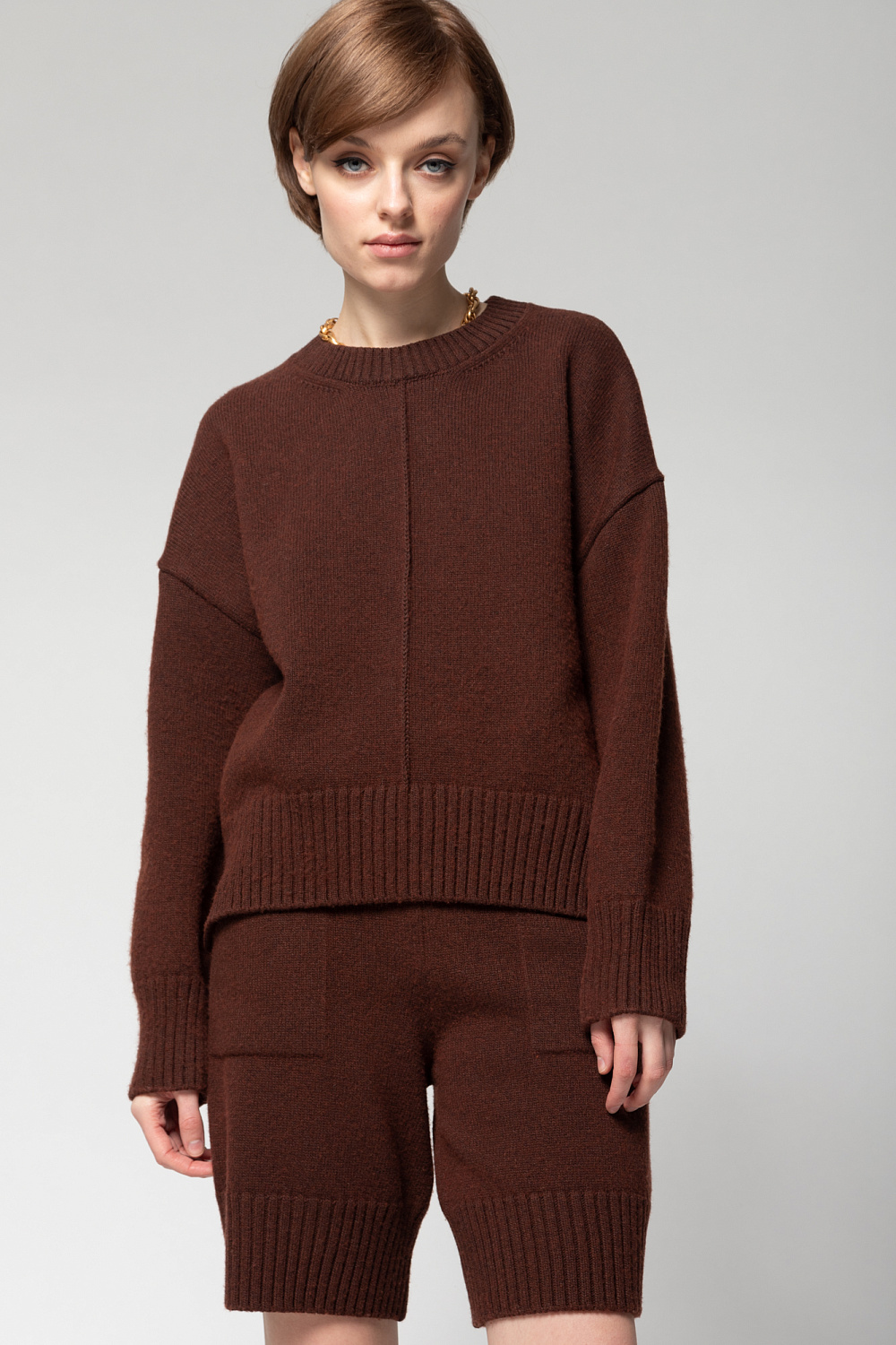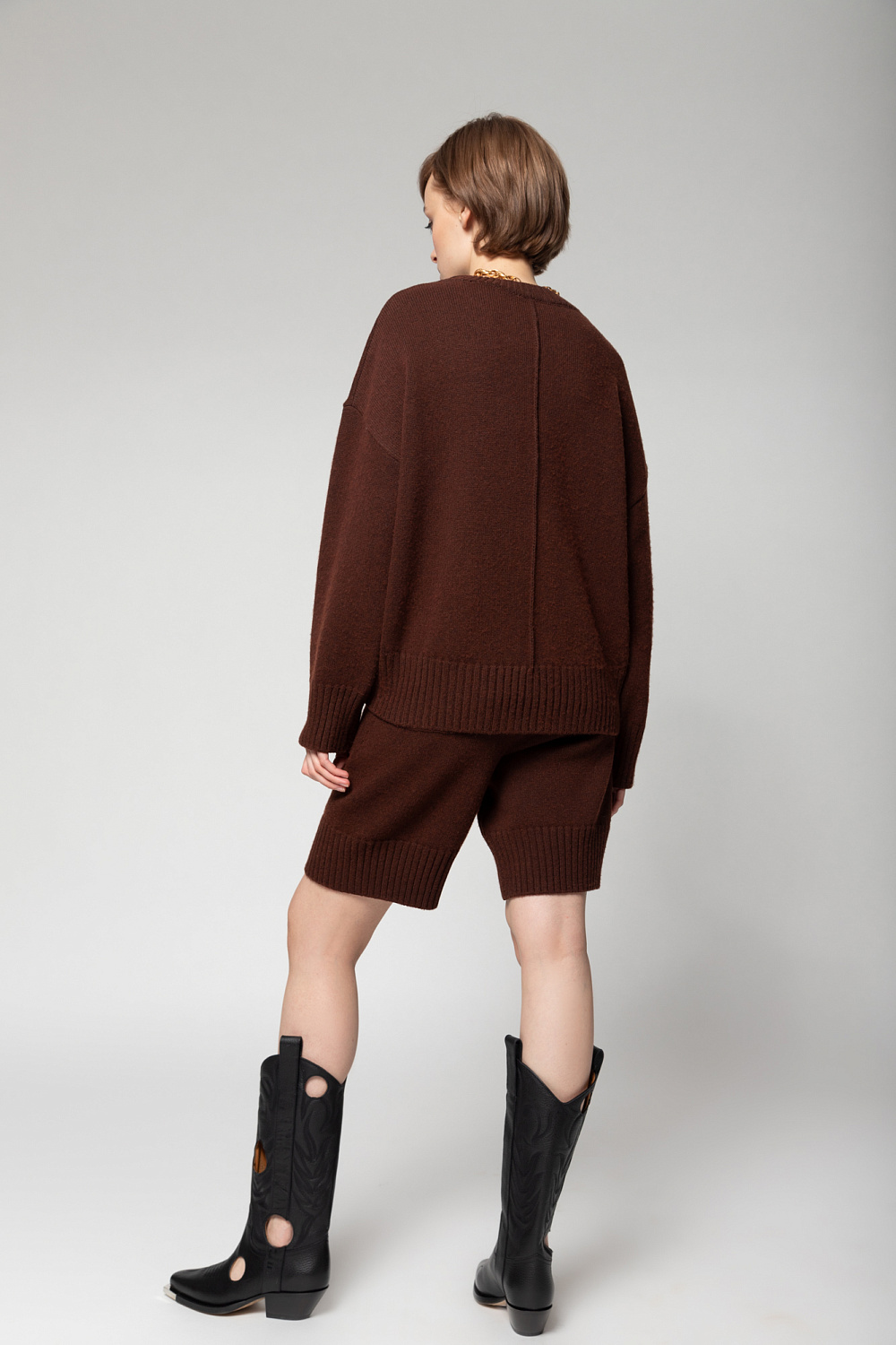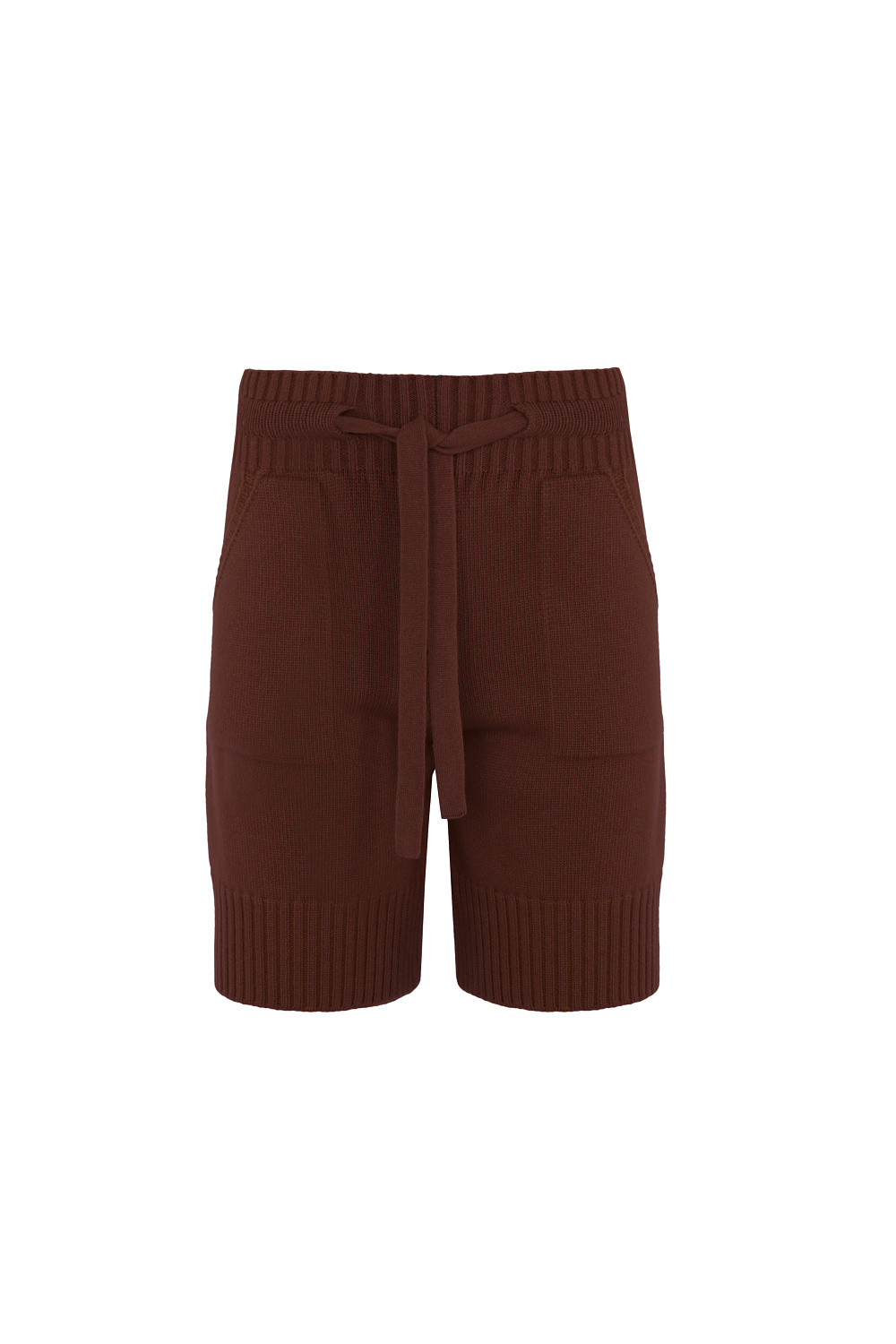 Long knitted shorts with wide elastic. Model with side pockets. Drawstring on the belt.