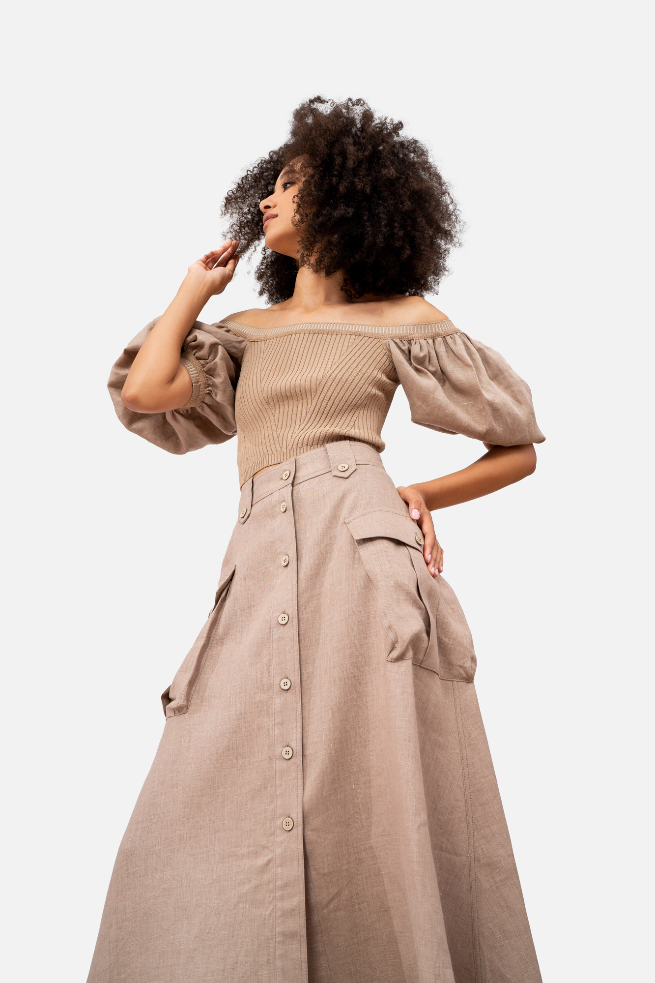 A skirt-trapel of 100% flax creates a direct and light image, and overhead volumetric pockets give practicality.