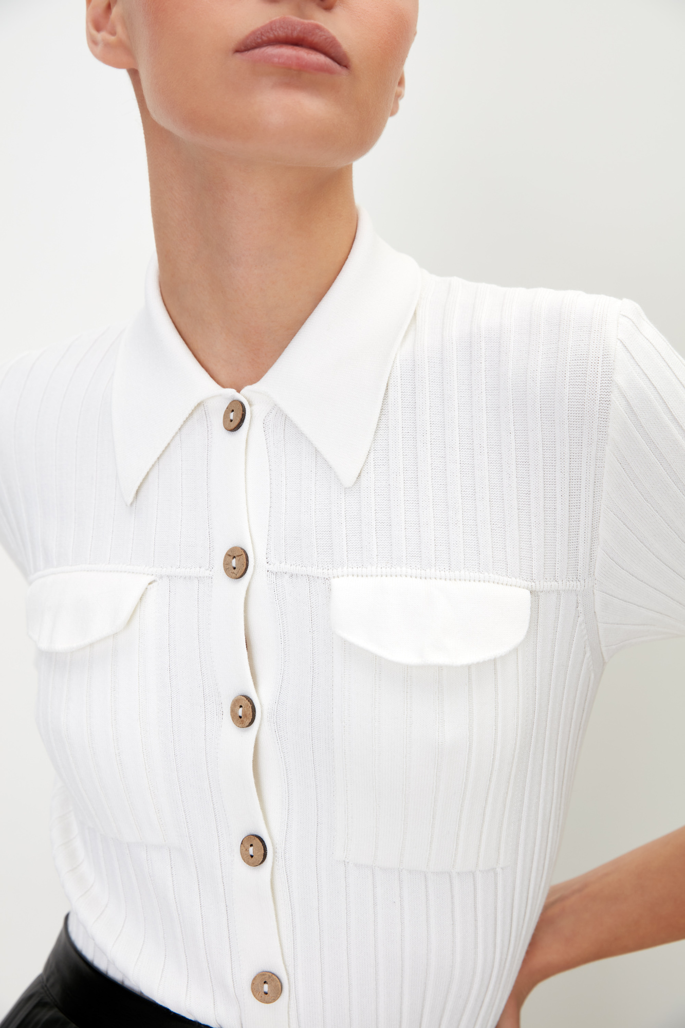 Knitted T-shirt with a button-down collar will add a formal edge to your look.