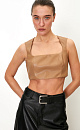 Faux leather top with a square neckline and zip fastening at the back. You can complete the look with a pleated skirt.