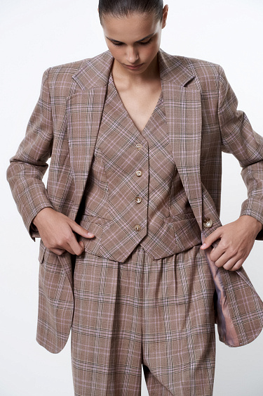 Classic straight-fit wool blend vest. Features V-neck and false welt pockets. Button closure. You can complete the look with a matching blazer and trousers.