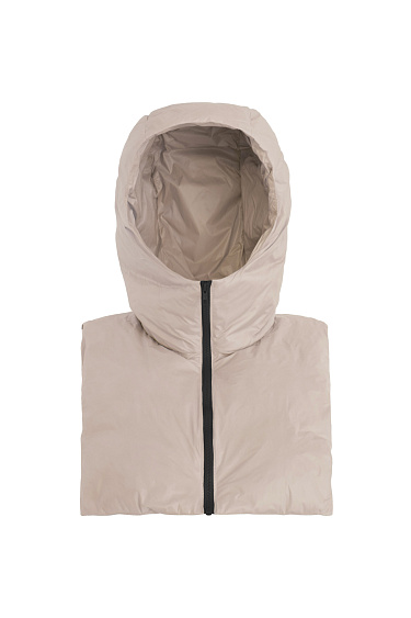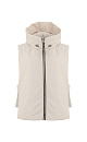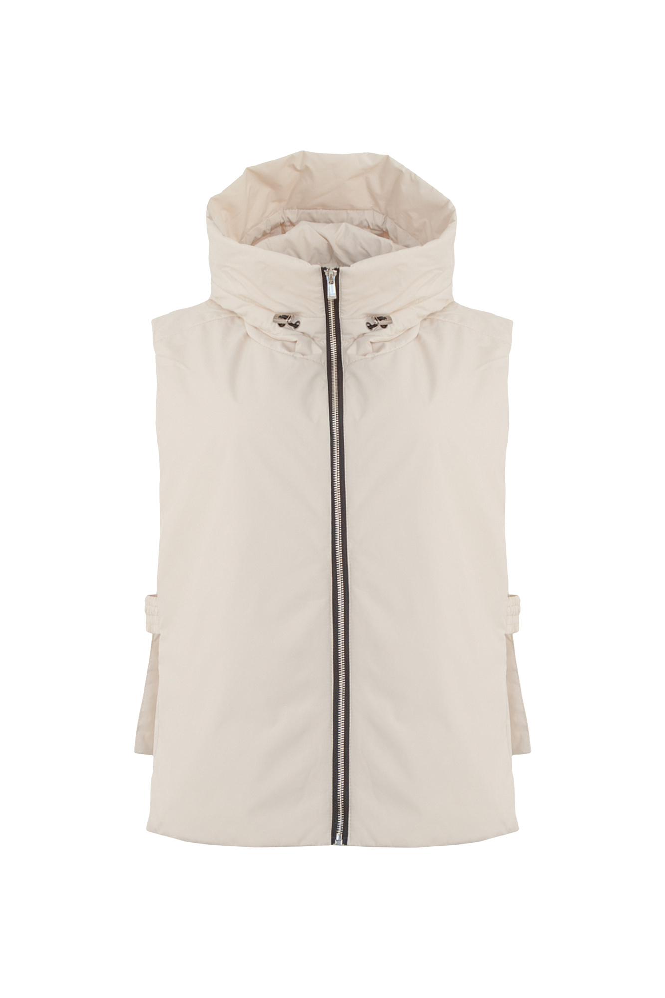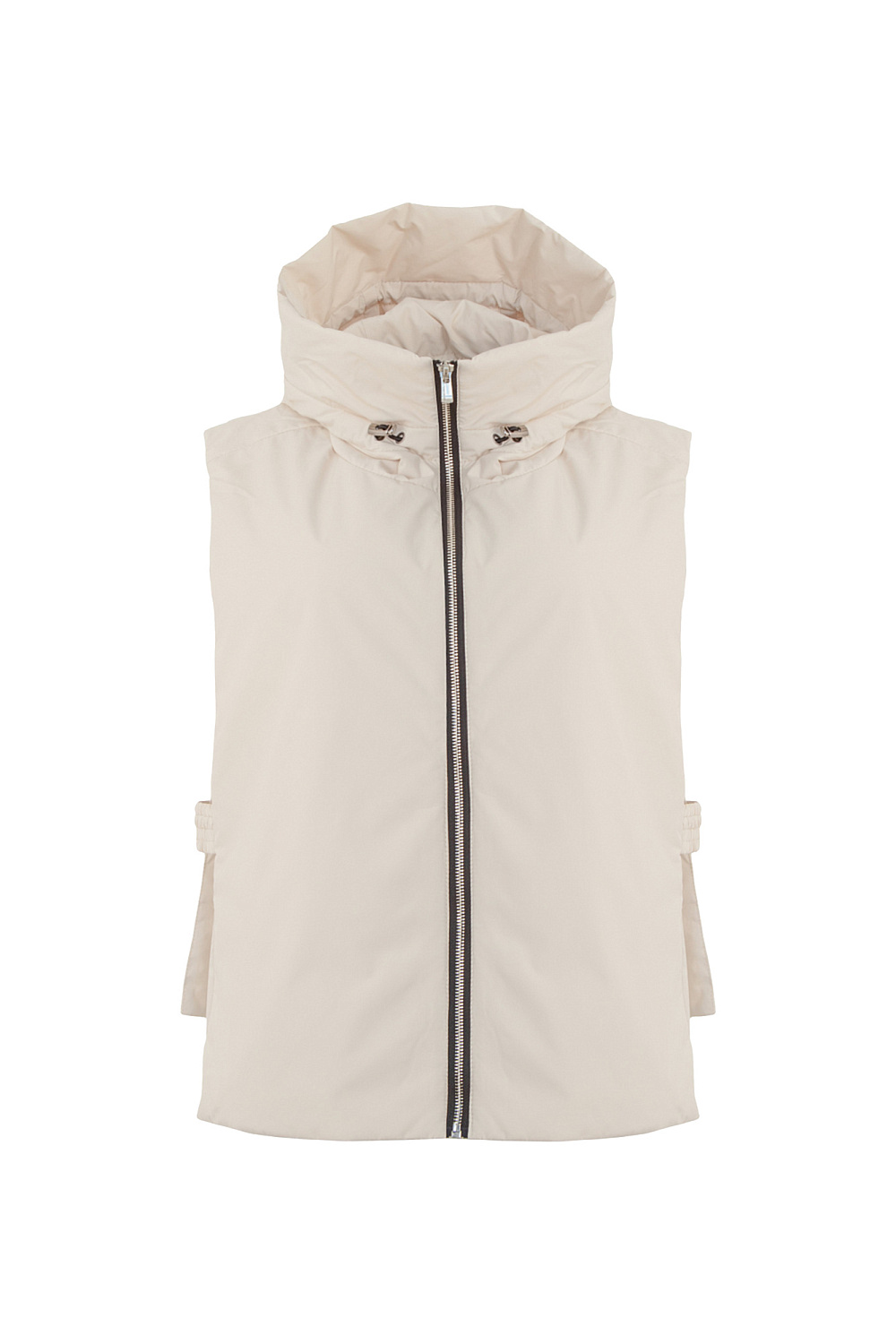 Puffer vest with cutouts on the sides and a hood with an adjustable drawstring.