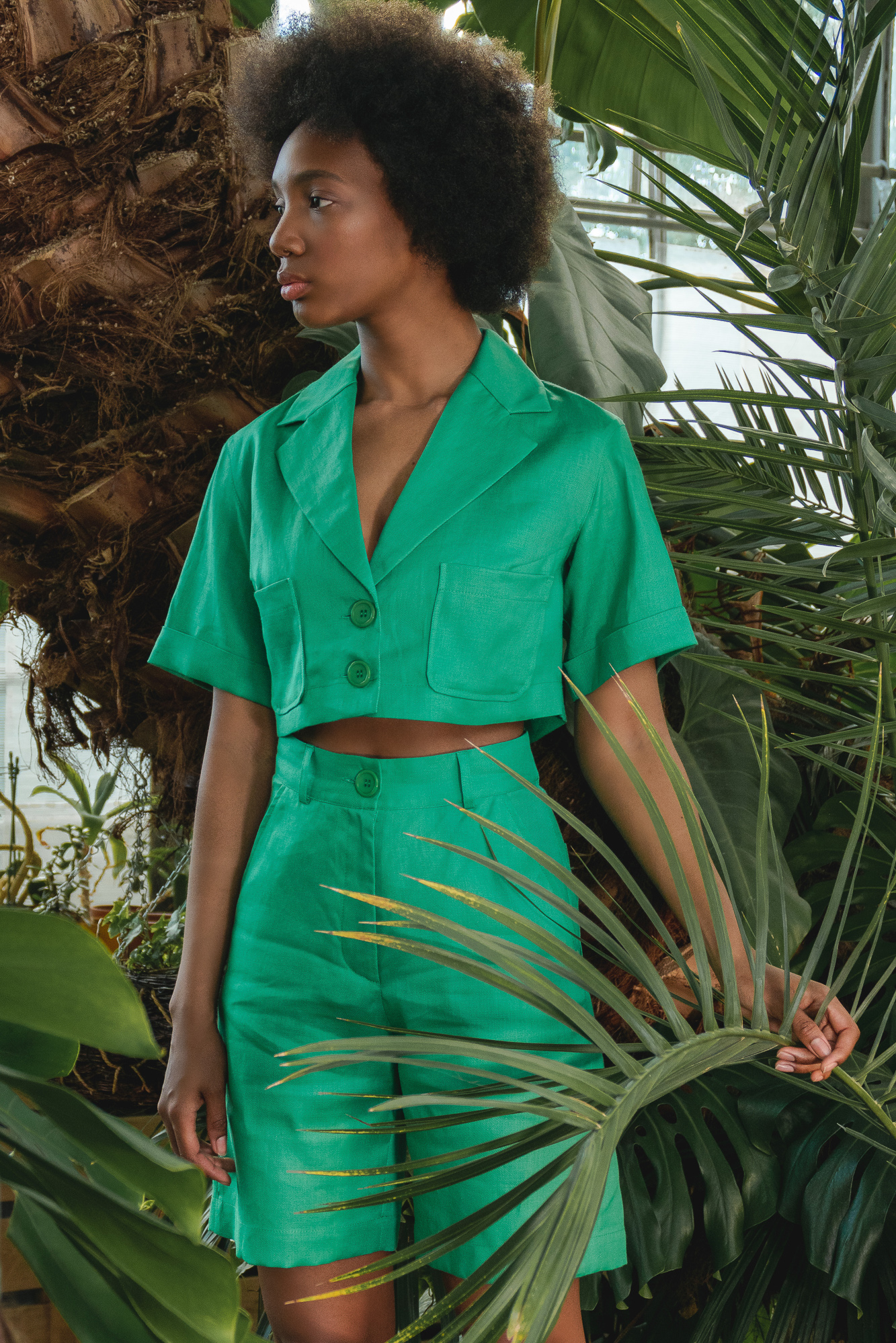 Set of linen cropped jacket with buttons and pockets. Bermuda shorts with pockets, zipper and button closure.
