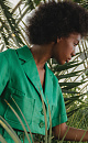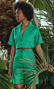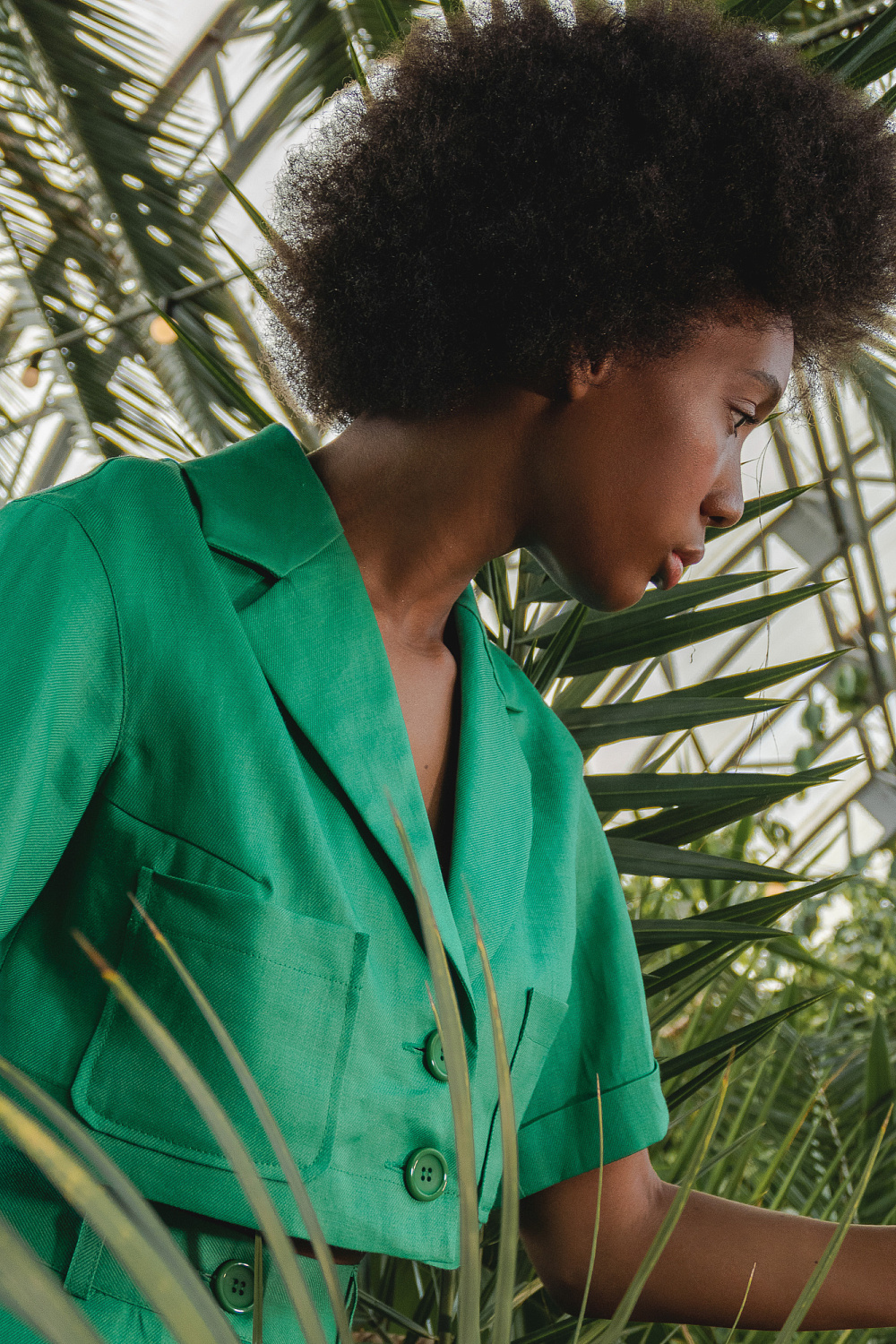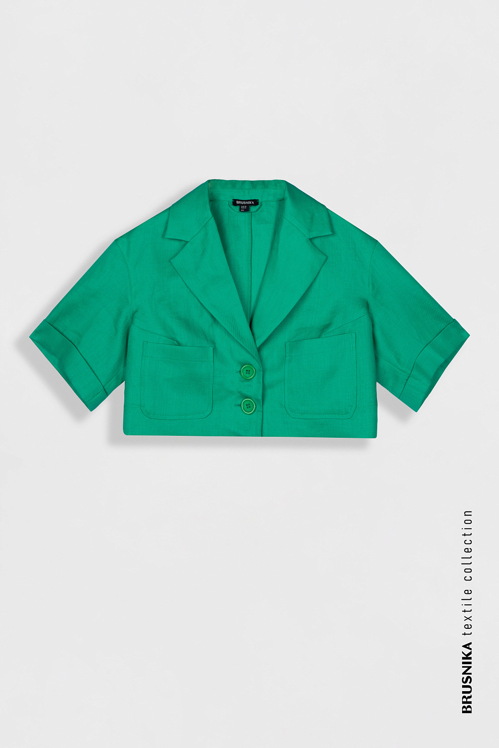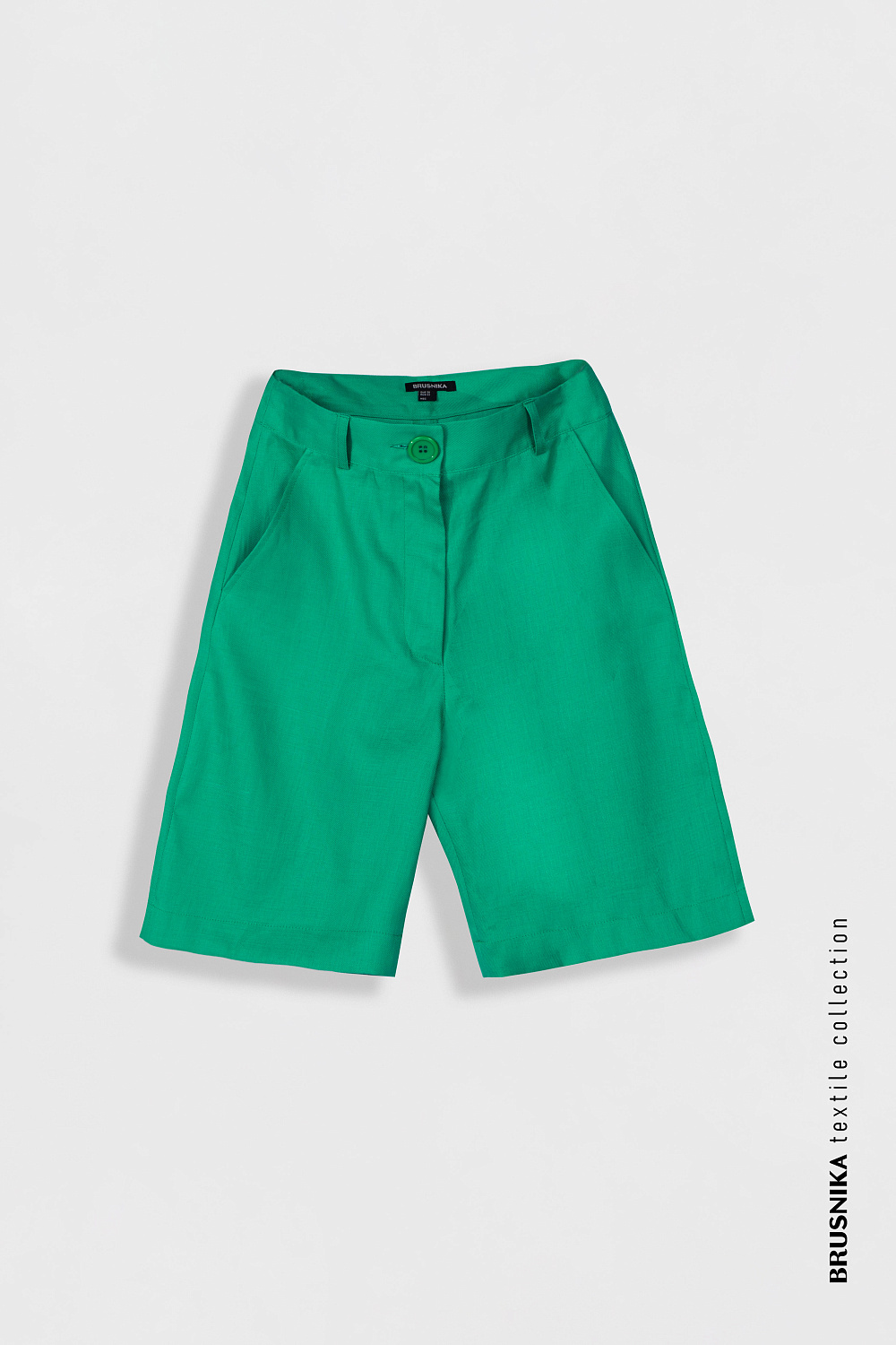 Set of linen cropped jacket with buttons and pockets. Bermuda shorts with pockets, zipper and button closure.
