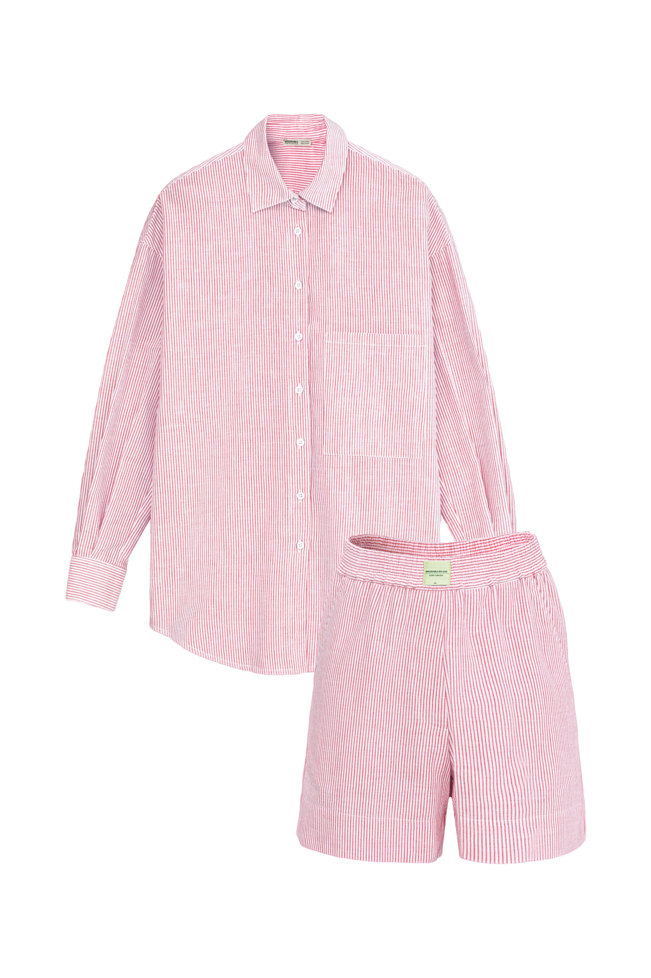 100% cotton set includes a shirt with a patch pocket and shorts with side pockets and a logo at the waist.