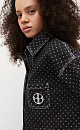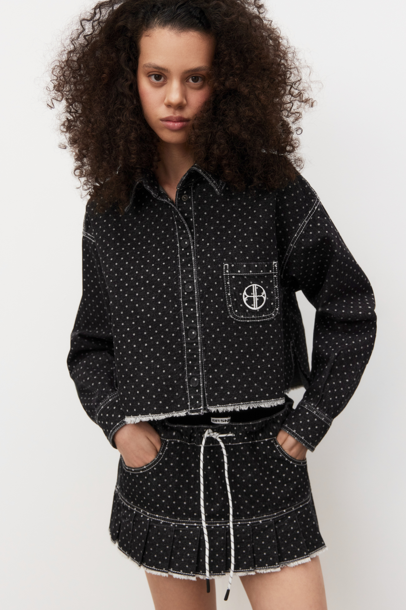 Printed 100% cotton denim shirt. A cropped silhouette with a long back, long sleeves with buttoned cuffs, a turn-down collar and a chest pocket with an embroidered brand logo. Magnetic button closure under the placket.
