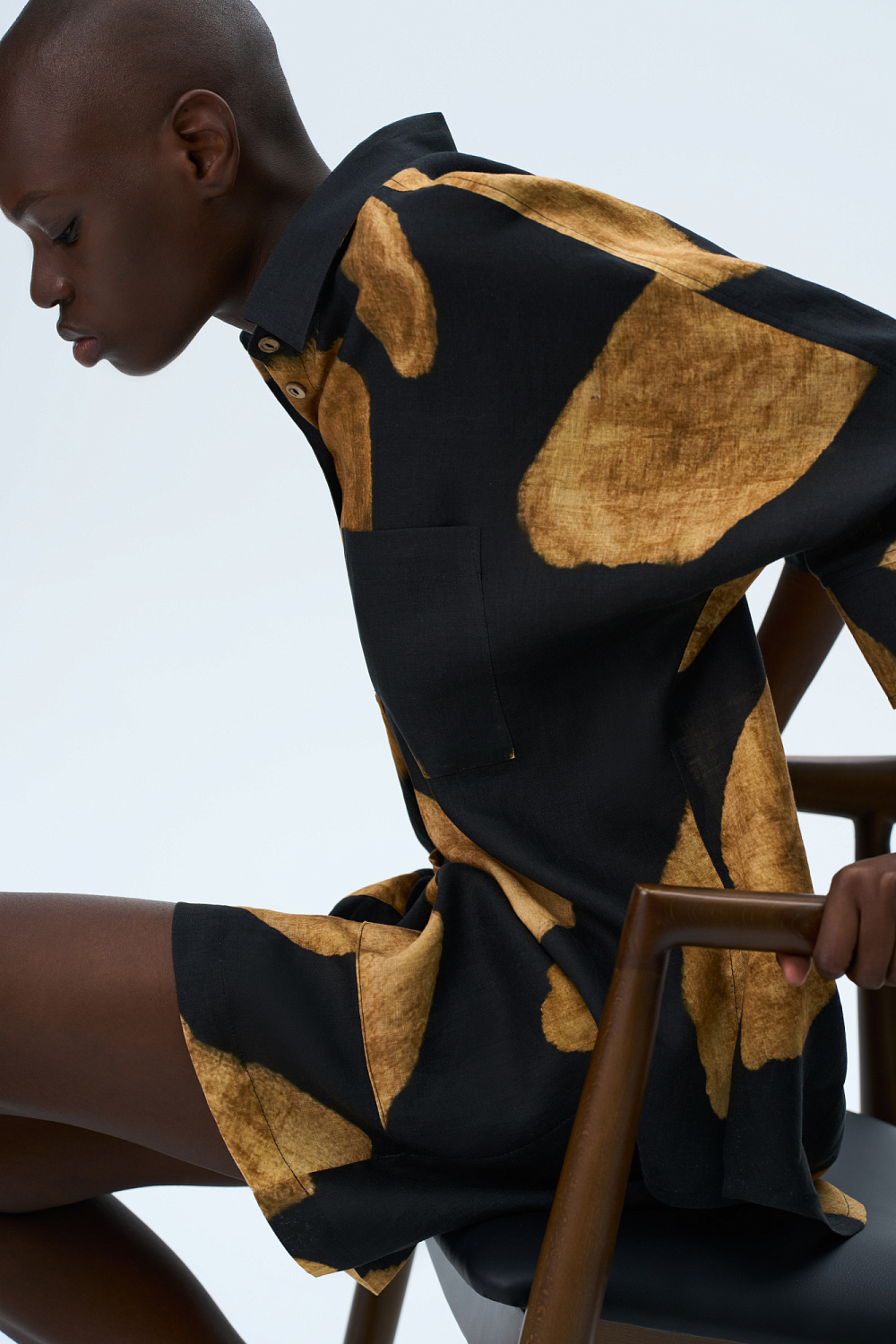 100% linen shirt with longline back. Relaxed silhouette with slits at the cuffs and sides. Patch pocket on the chest.