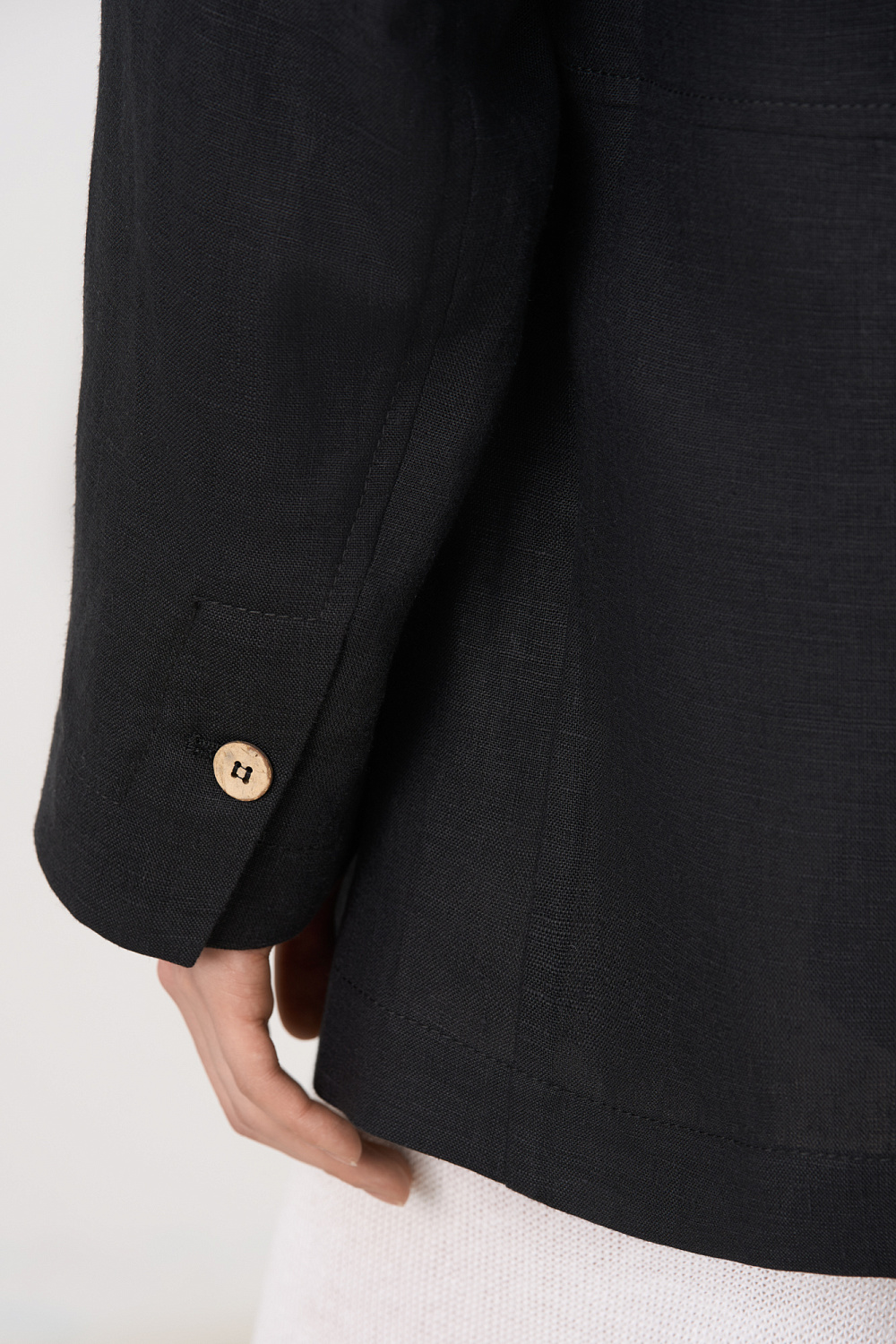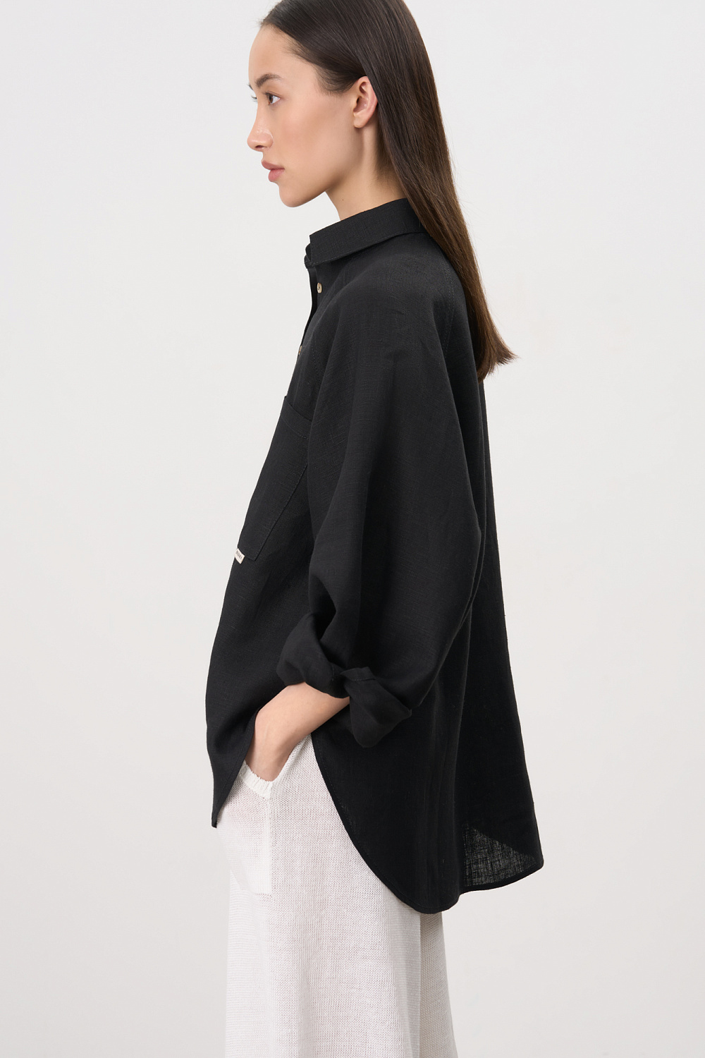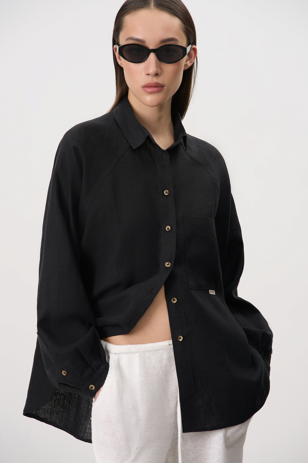 100% linen shirt with raglan sleeves. The model has a loose fit, long sleeves with short cuffs, a classic turn-down collar and a chest pocket with a branded label. Button closure.
