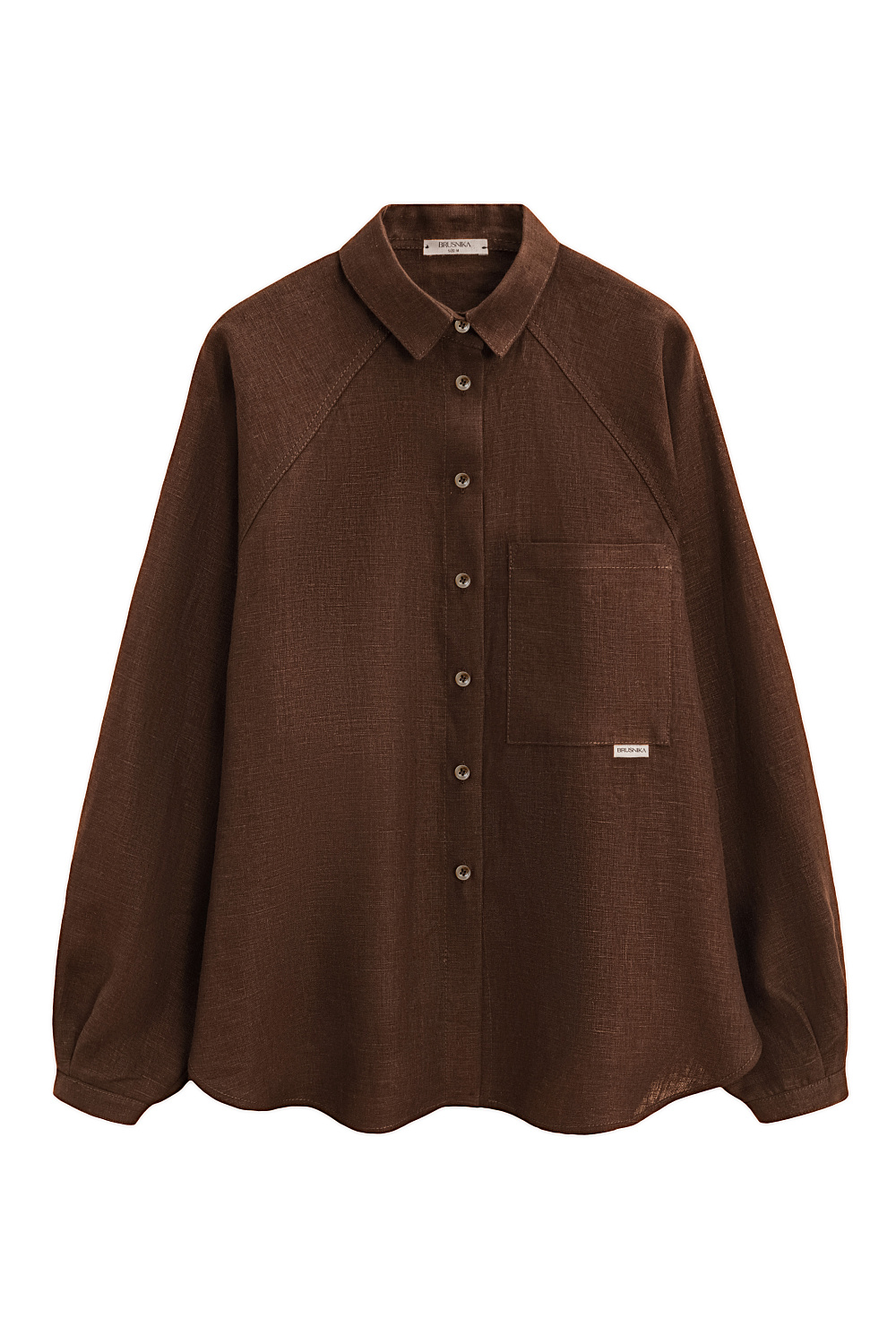 100% linen shirt with raglan sleeves. The model has a loose fit, long sleeves with short cuffs, a classic turn-down collar and a chest pocket with a branded label. Button closure.
