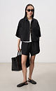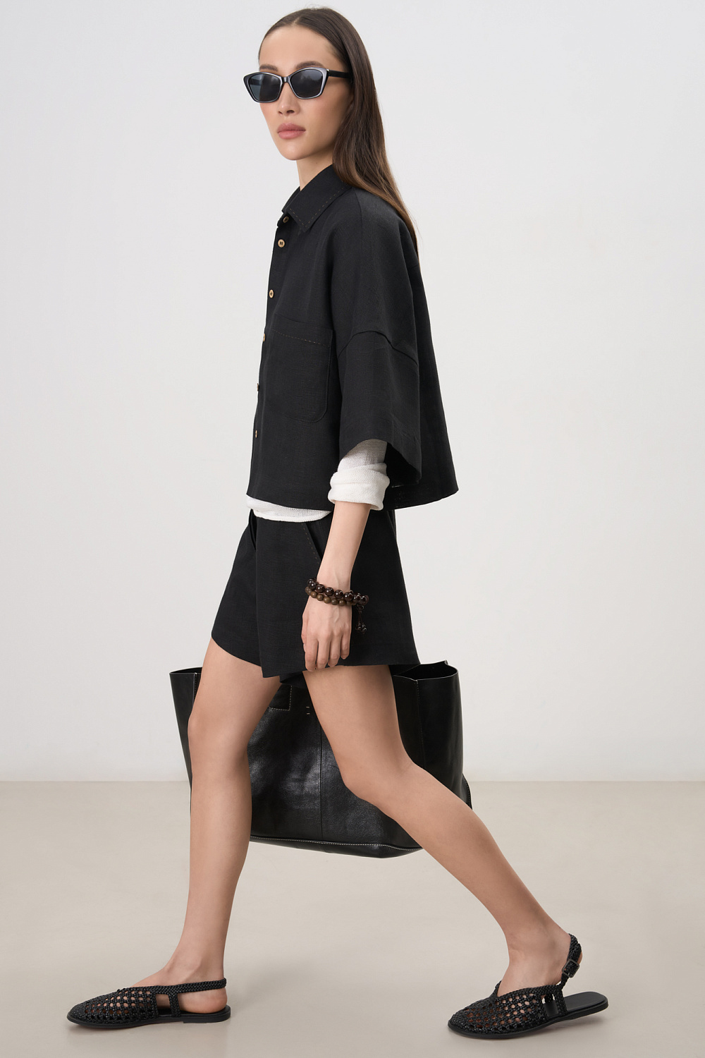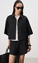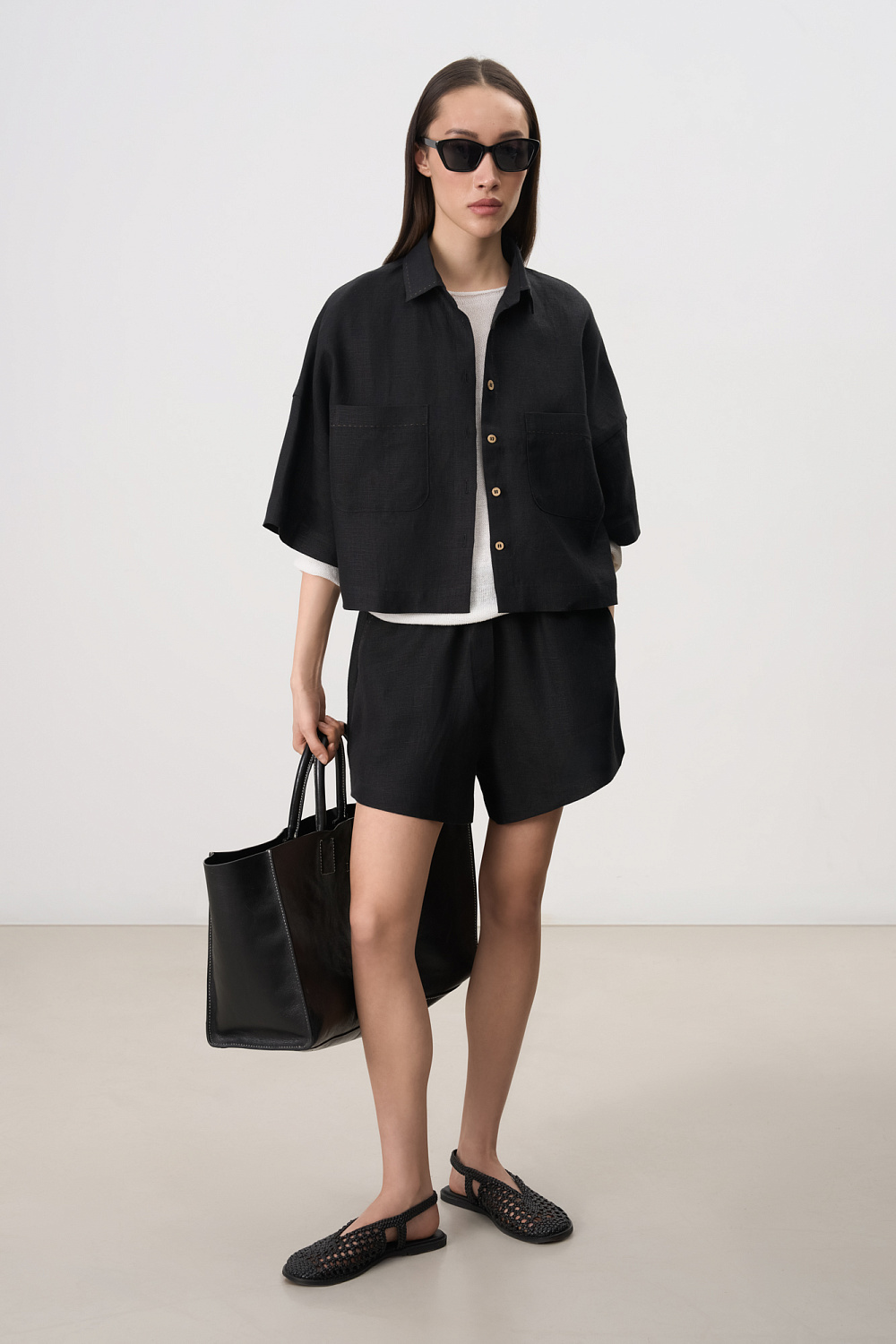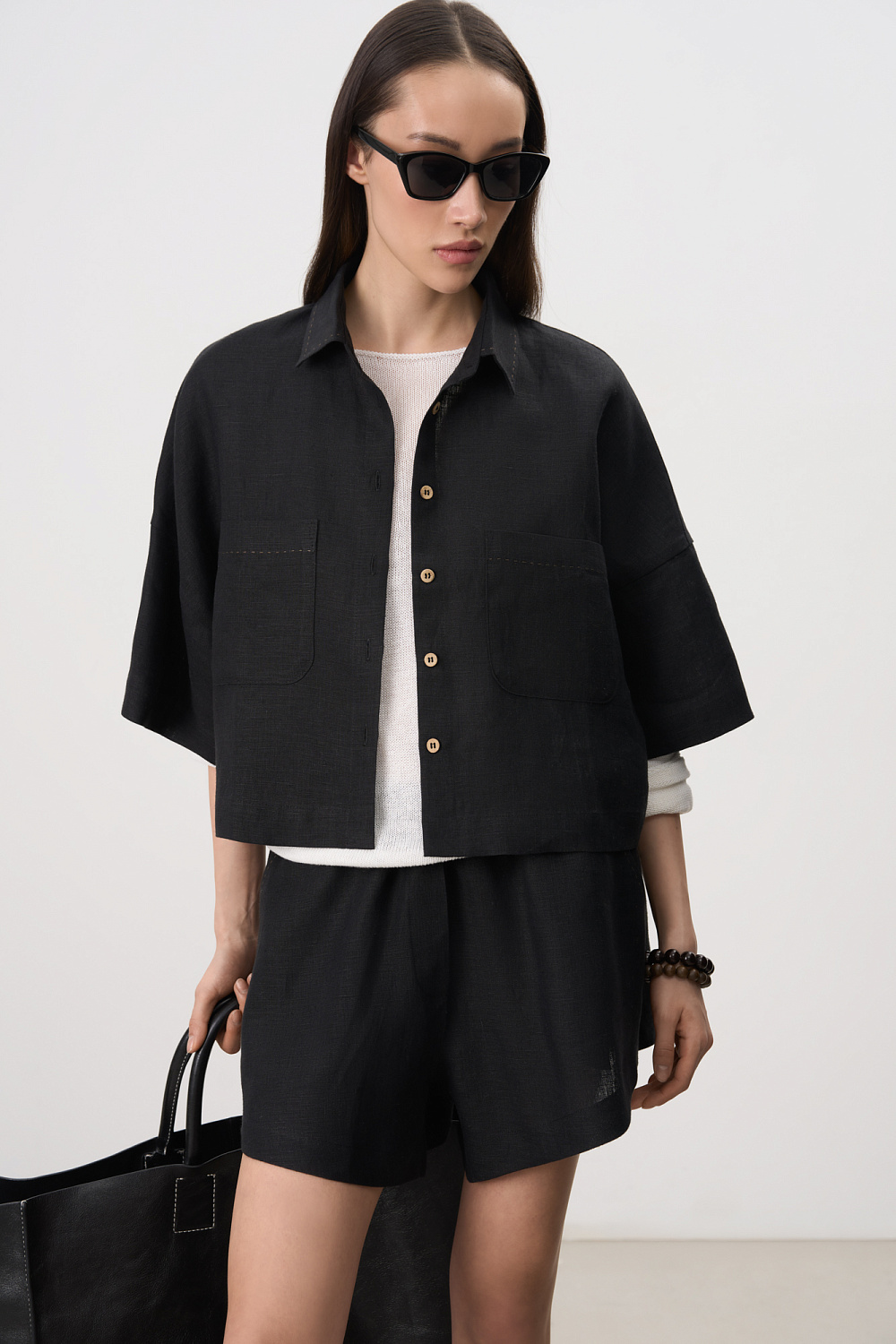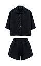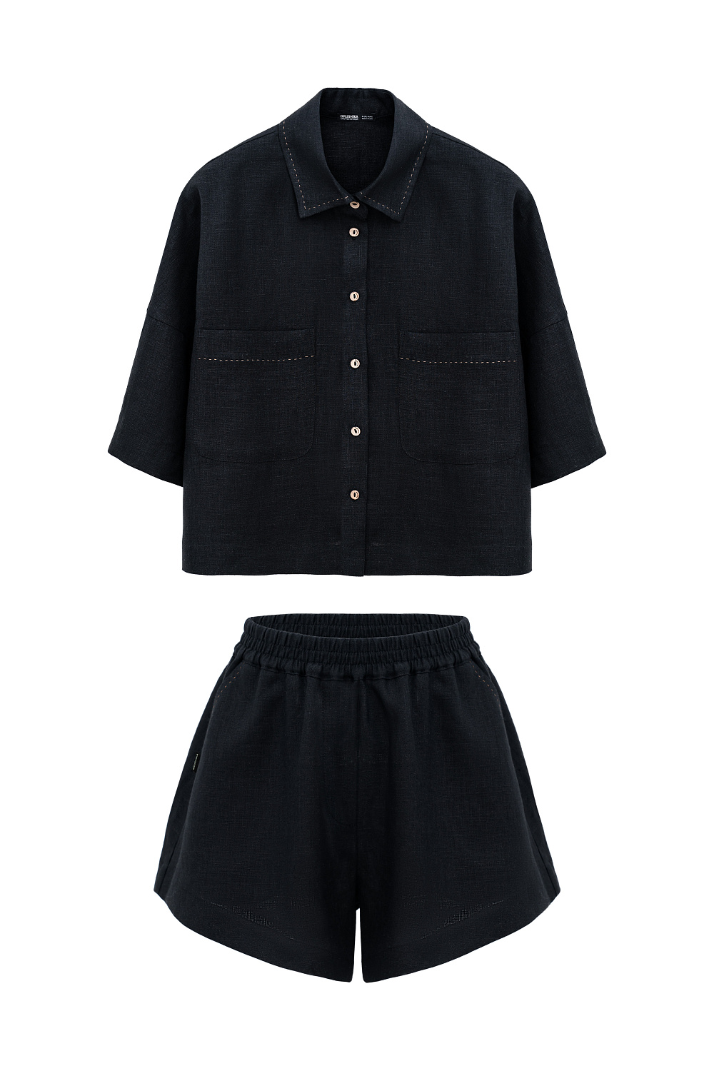 The set includes a cropped shirt with patch pockets, dropped shoulders and shorts with side pockets and an elastic waistband.