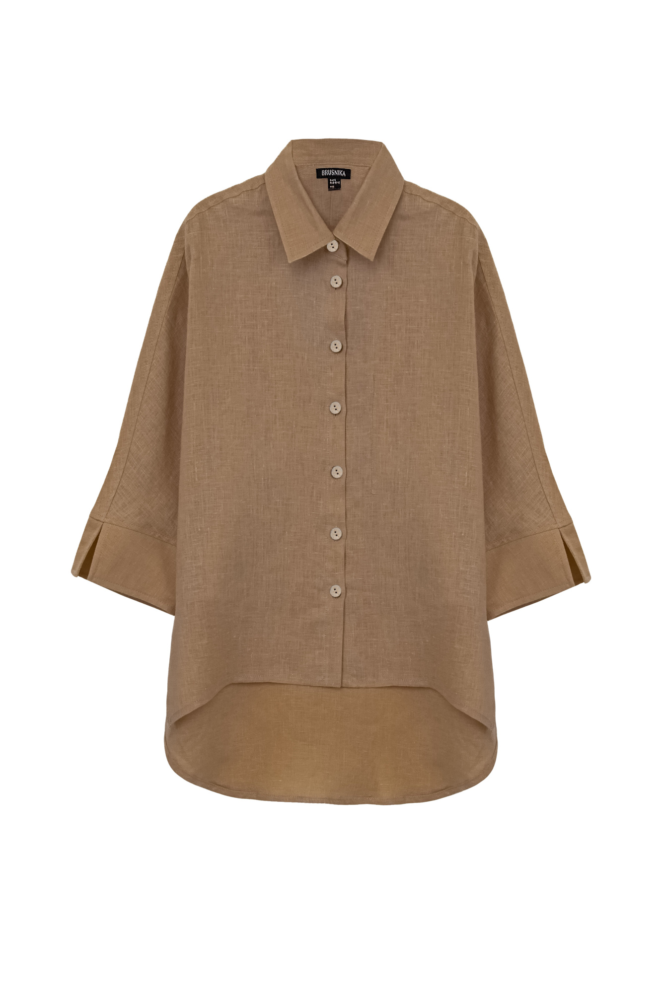 100% linen back longline shirt. Relaxed silhouette with slits at the cuffs and sides. Patch pocket on the chest.