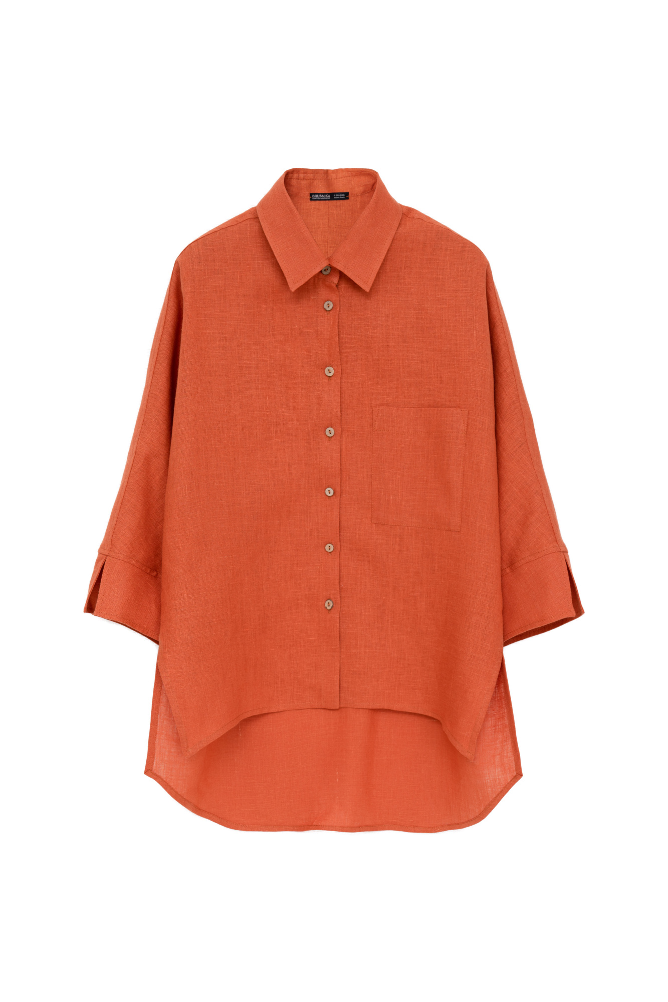 100% linen shirt with long back. Loose silhouette model with slits at the cuffs and sides. Patch pocket on the chest.