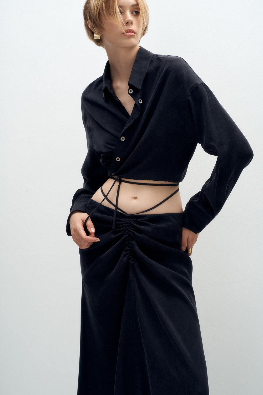 Cropped 100% cupra wrap shirt with dropped shoulder and ties.