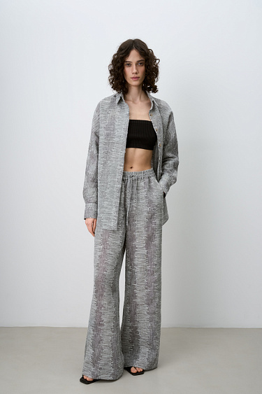 100% linen shirt with supate button fastening. The model has a loose silhouette, with a classic turn-down collar and long sleeves.