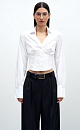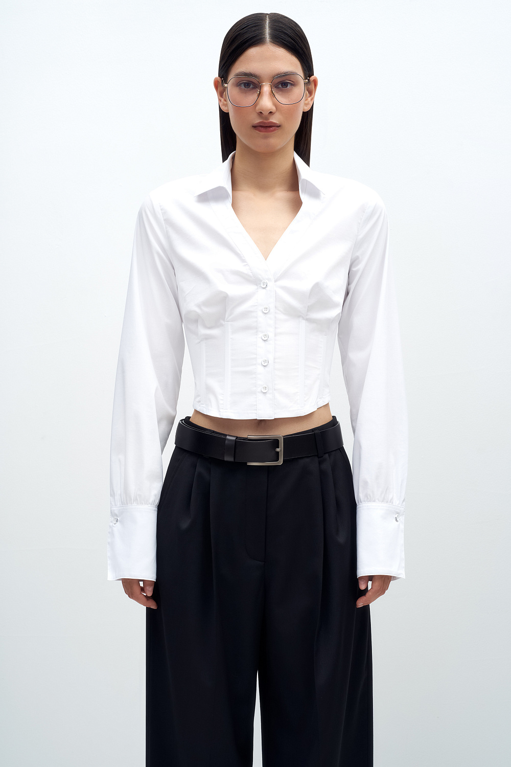 Cropped corset-shirt with V-neck. Fitted silhouette with a turn-down collar and button closure.