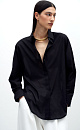 100% cotton basic shirt. Turn-down collar, long sleeves with button cuffs and a rounded hem. Front hidden button closure.