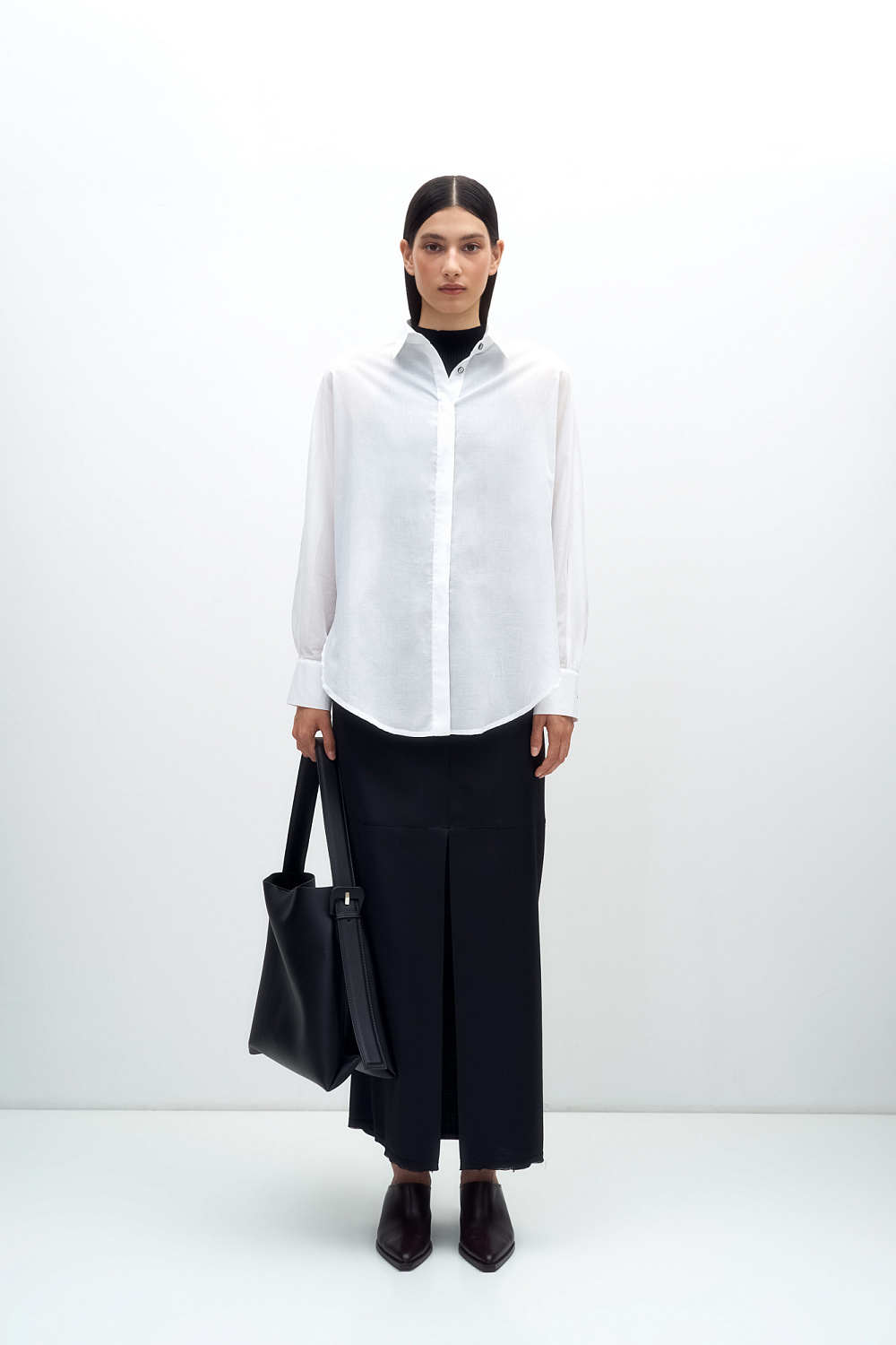 100% cotton basic shirt. Turn-down collar, long sleeves with button cuffs and a rounded hem. Front hidden button closure.
