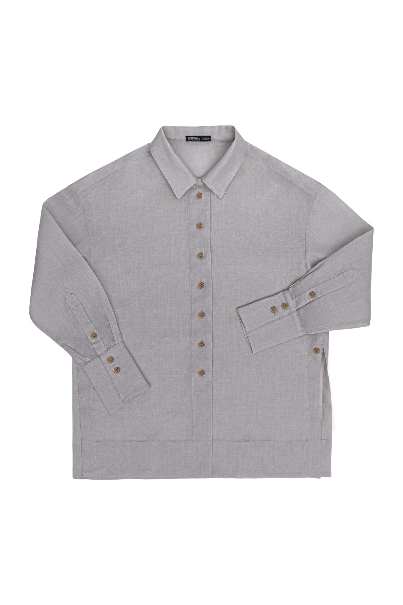 Semi-sheer shirt made from 100% nettle. Features loose silhouette with classic collar and cuffs. Button closure. Nettle fabric is very lightweight, does not electrify, and its natural origin emphasizes the environmental friendliness of this model