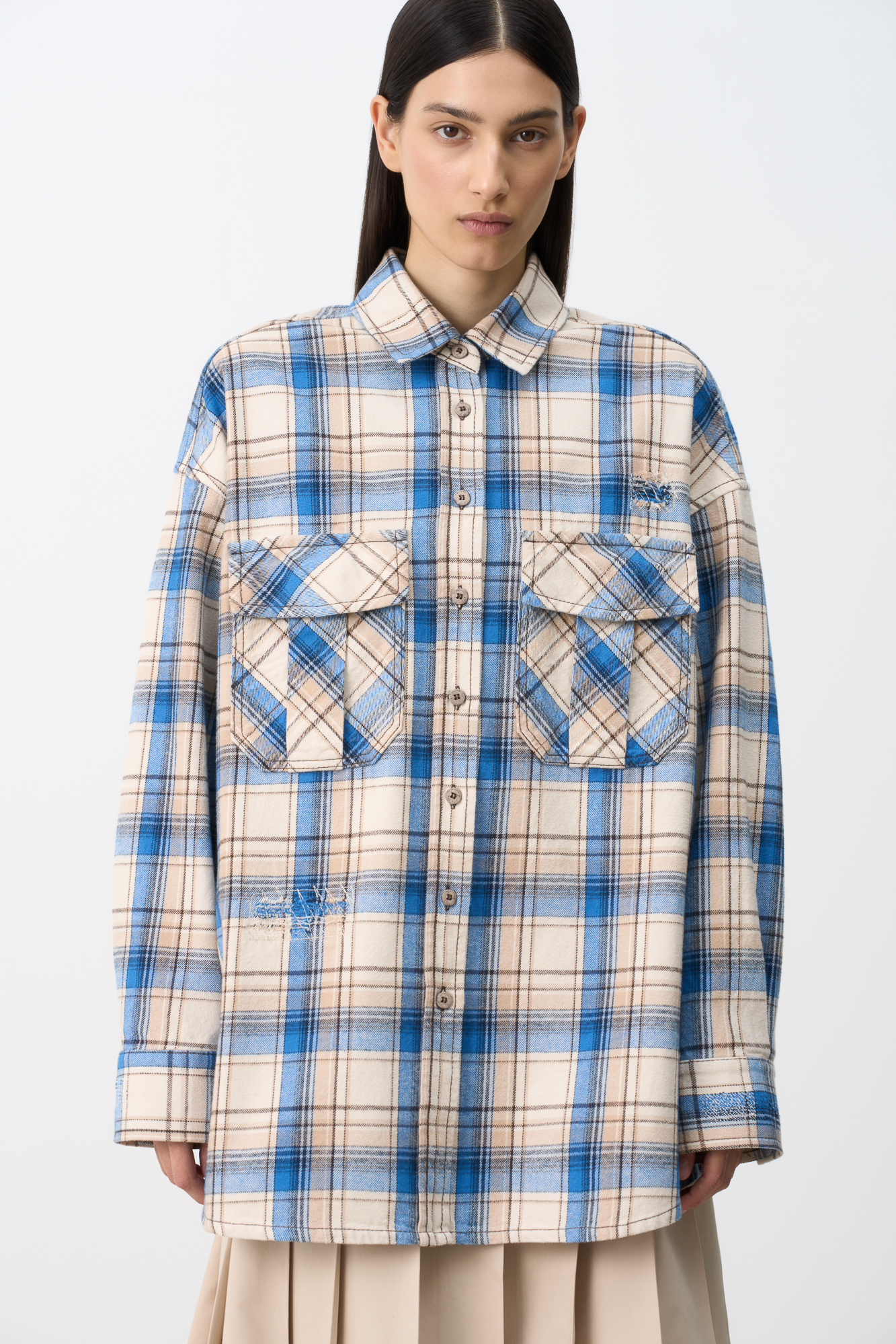 Checkered shirt with patch pockets on the chest. Loose silhouette model with dropped shoulder line.