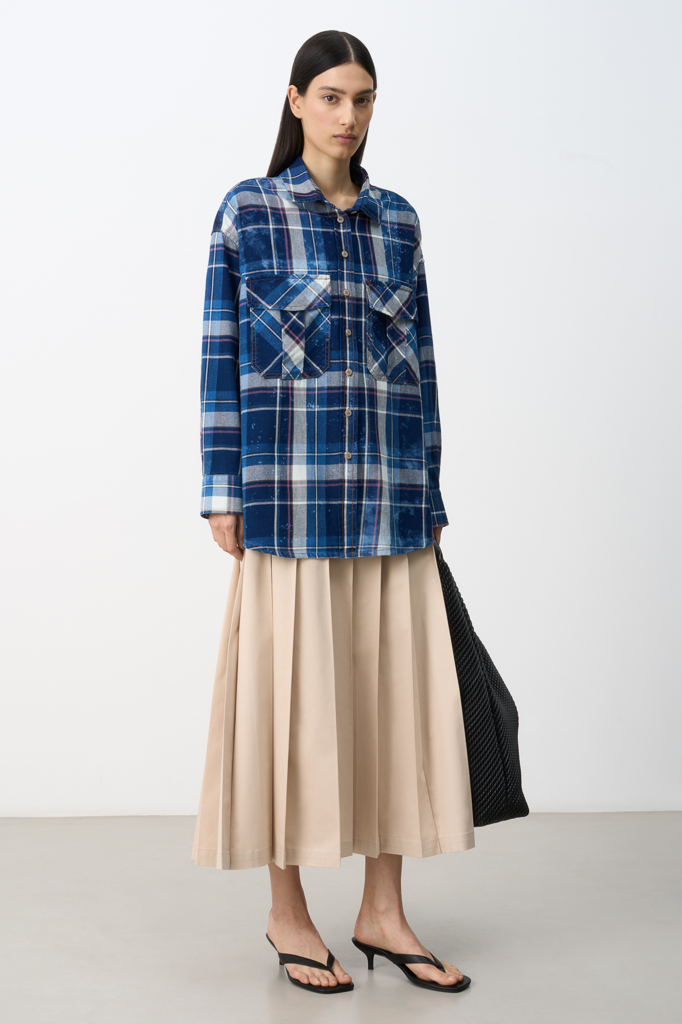 100% cotton check shirt with tie-dye effect. The model has a straight cut, with a classic turn-down collar, long sleeves, dropped shoulders and two patch pockets on the chest.