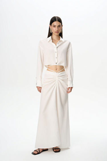 Cropped shirt with ties. Loose fit silhouette with dropped shoulders, buttoned cuffs. You can complete the look with a matching skirt.