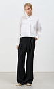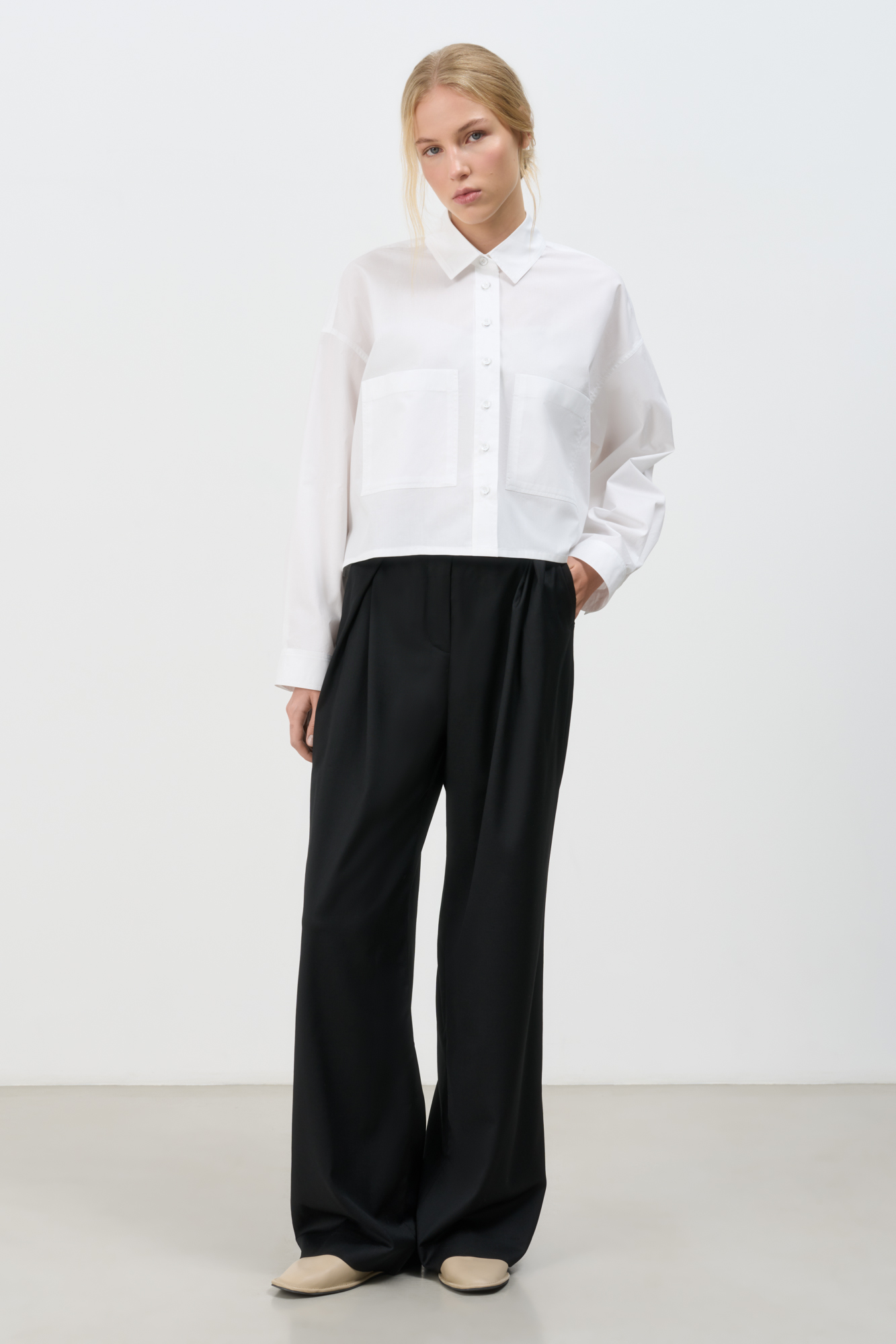 Short shirt with patch pockets. Loose silhouette model with dropped shoulder line. Button closure.