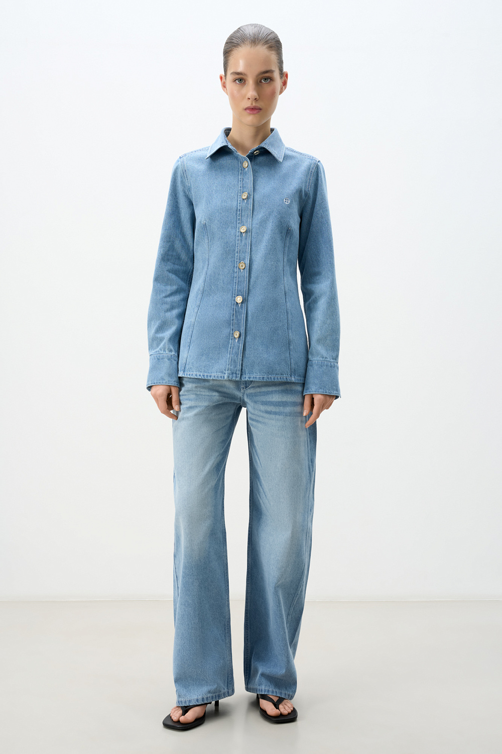 100% cotton denim shirt. A fitted silhouette with a classic turn-down collar and long sleeves with buttoned cuffs. Button closure. The product is decorated with an embroidered brand logo on the chest.