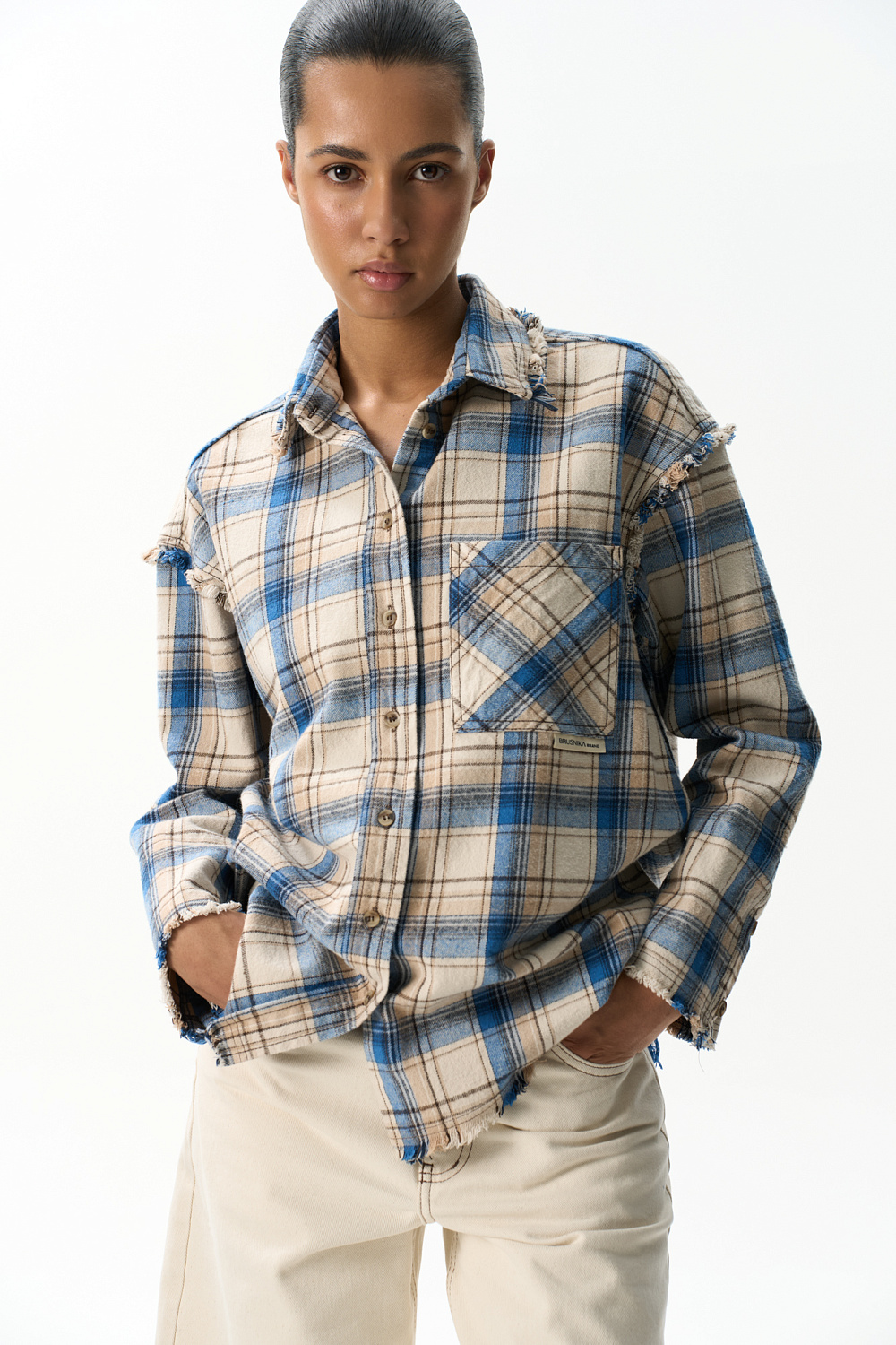 100% cotton checkered shirt. Straight-fit model with a turn-down collar and a chest pocket with the brand logo. The product is decorated with an imitation of a raw edge.