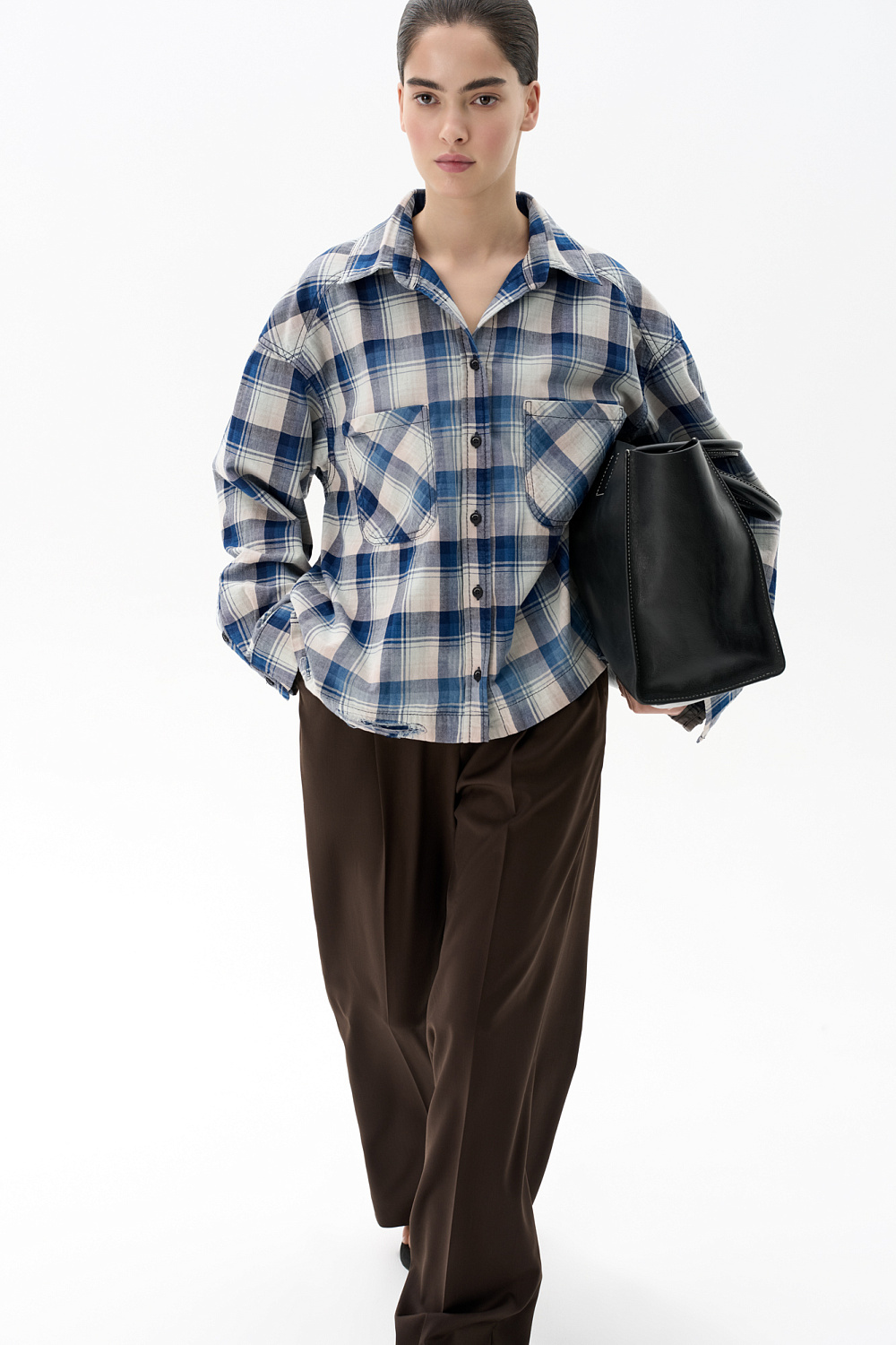 100% cotton plaid shirt. Straight cut, dropped shoulders, classic turn-down collar, two chest pockets and button closure. Supplemented with decorative elements imitating scuffs and torn edges.