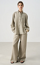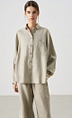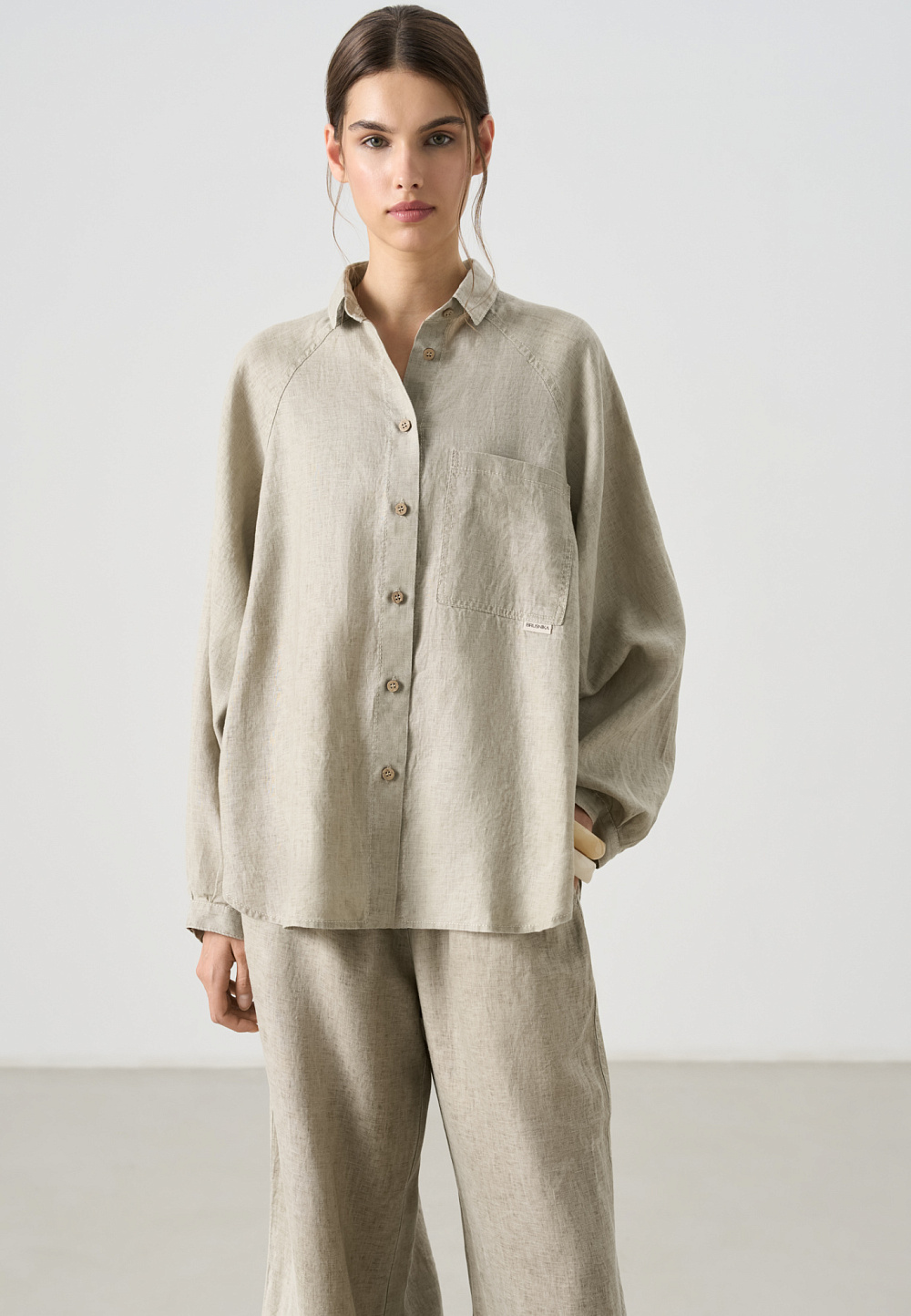 100% linen shirt. The model has a loose fit, long raglan sleeves, a turn-down collar, a chest pocket and an elongated back. Button closure.