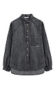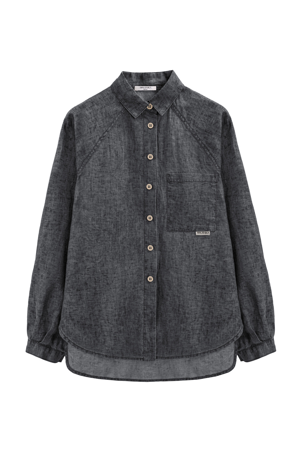 100% linen shirt. The model has a loose fit, long raglan sleeves, a turn-down collar, a chest pocket and an elongated back. Button closure.