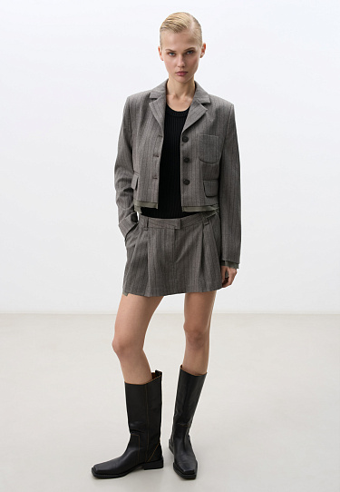 Striped wool shirt. The model has a straight fit, long sleeves, flared cuffs, a classic turn-down collar and enlarged shoulders. Button fastening under the placket.