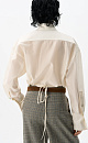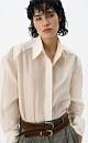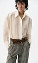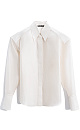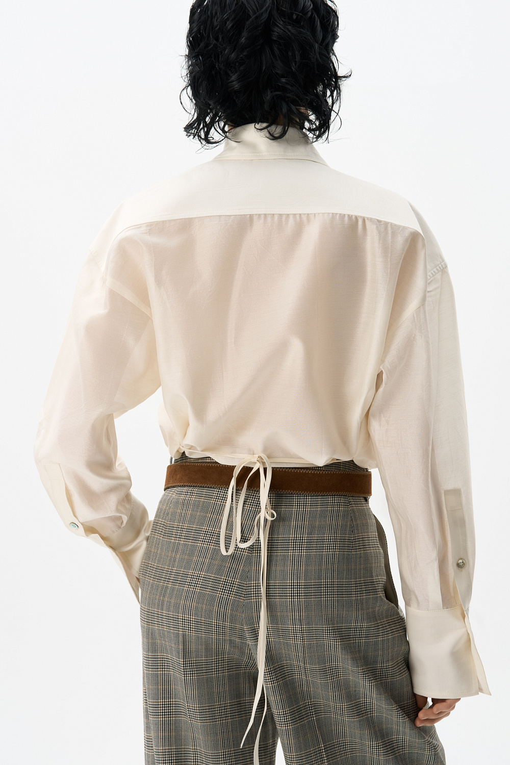 Shirt made of silk with added cotton. Straight-fit model with long sleeves with wide cuffs, a classic turn-down collar, oversized shoulders and a tie at the back. Button fastening under the placket.