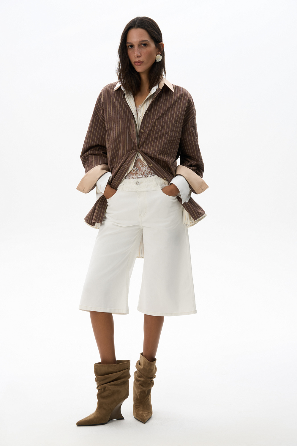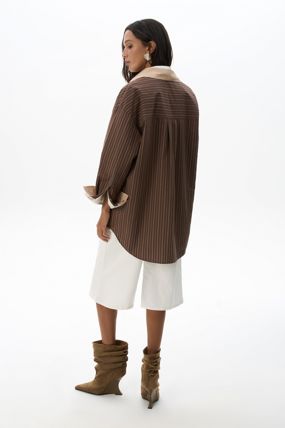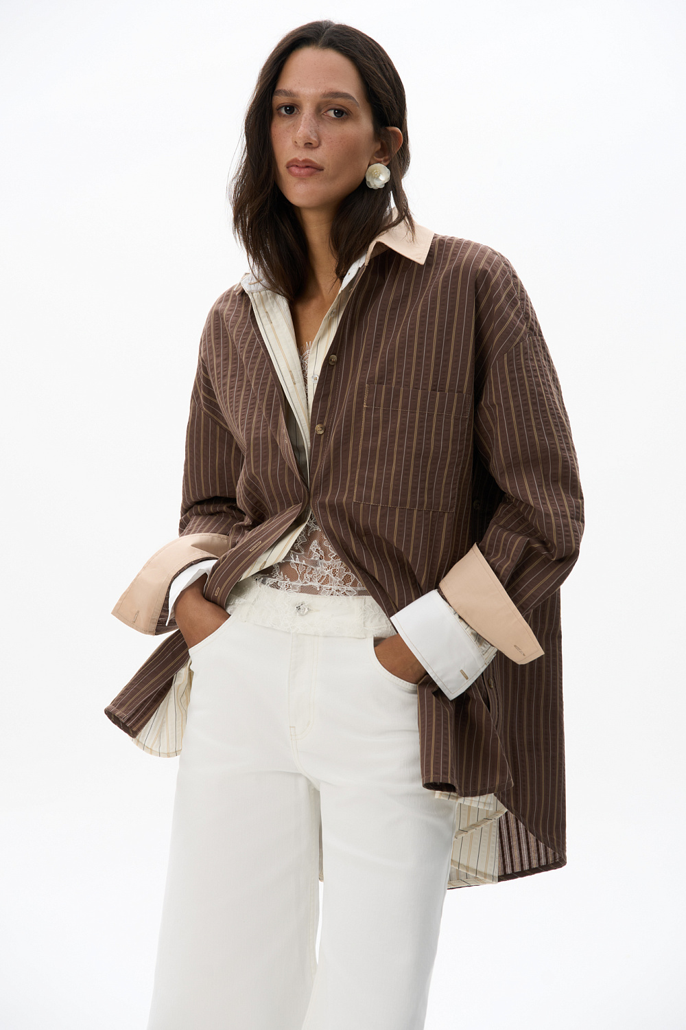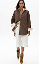 100% cotton shirt with striped print, plain cuffs and turn-down collar. Straight cut model with dropped shoulders. Shirt with two fastening options: classic and oblique.