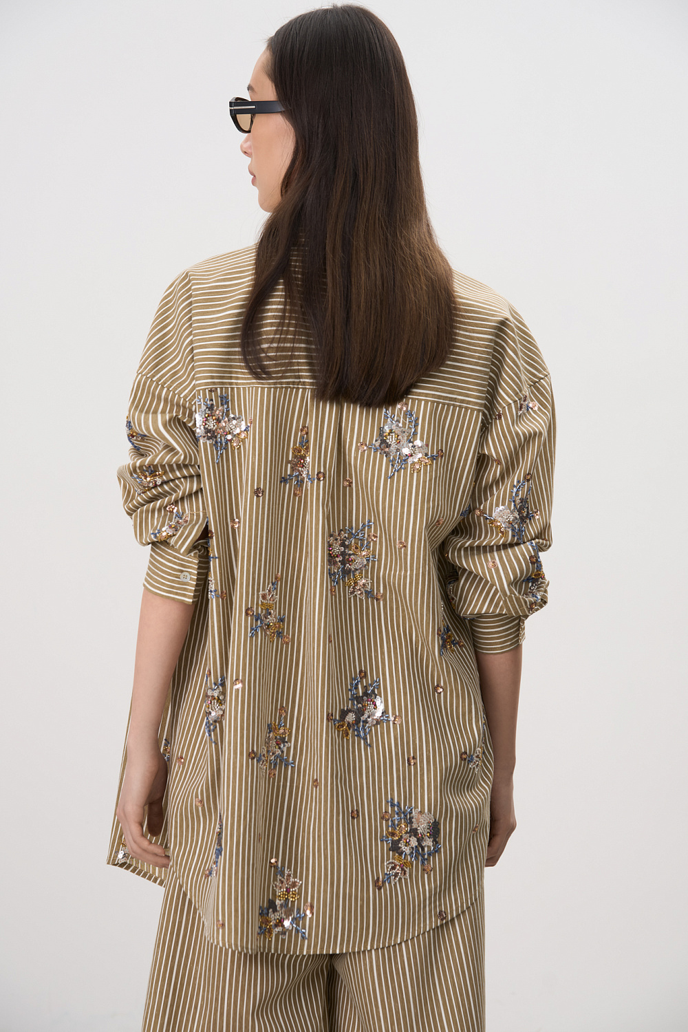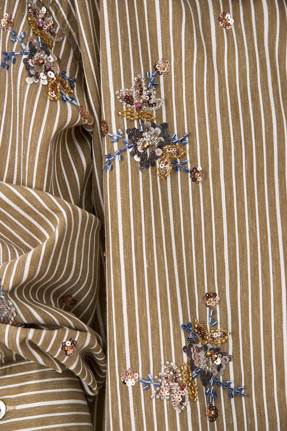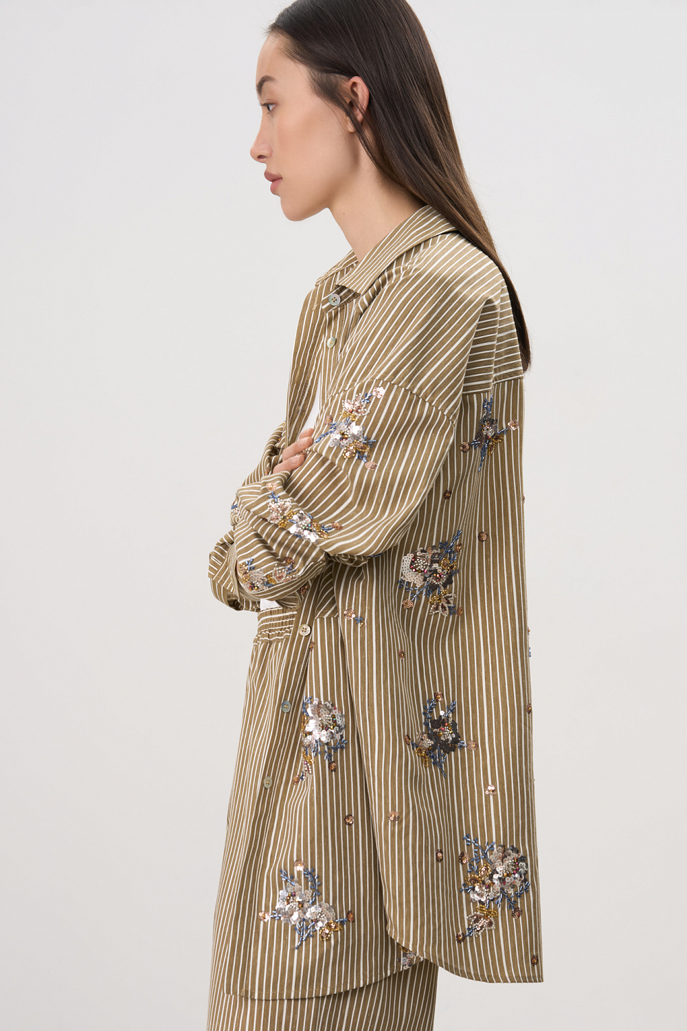 Striped shirt made of viscose and linen, decorated with sequin and bead embroidery. Features long sleeves, button cuffs, a classic turn-down collar, chest pocket and button closure. You can complement the look with trousers in the same style.