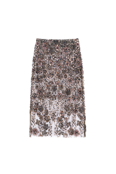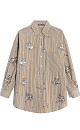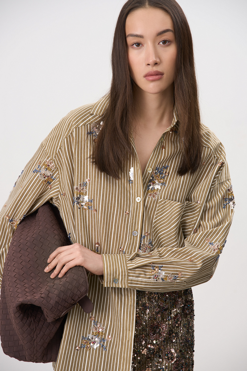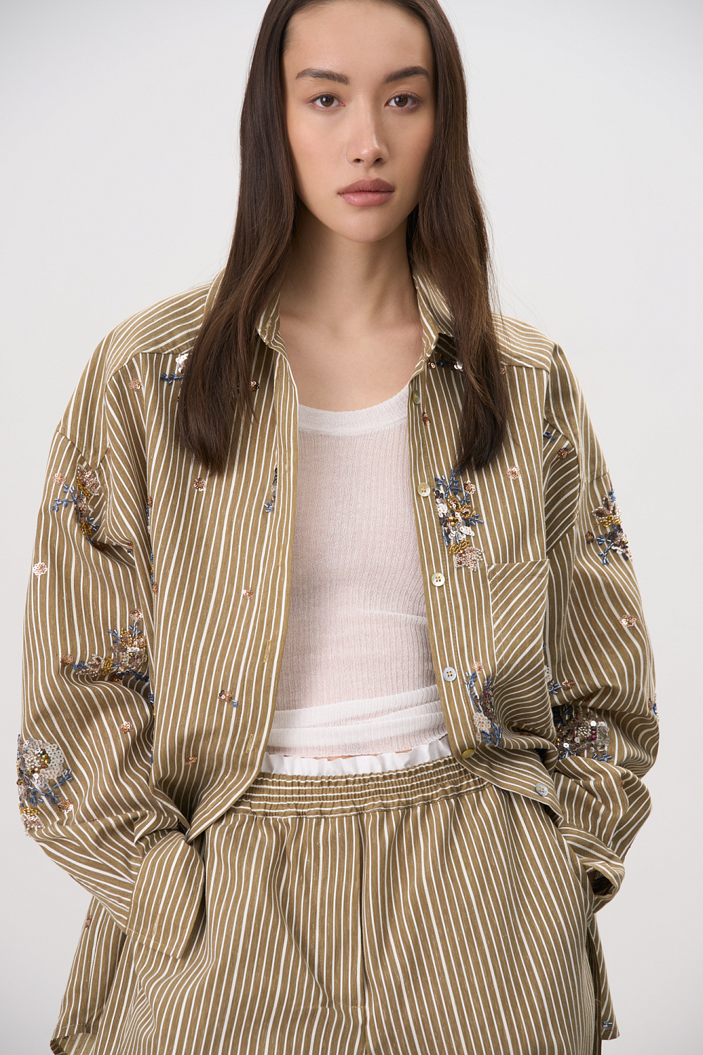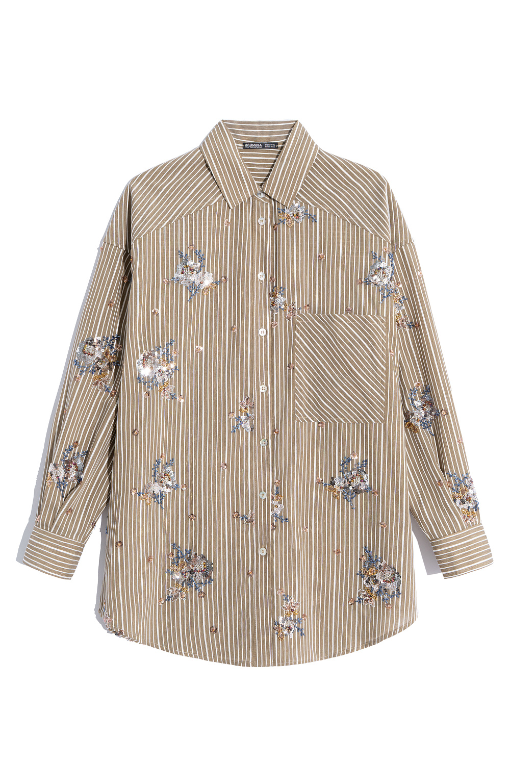 Striped shirt made of viscose and linen, decorated with sequin and bead embroidery. Features long sleeves, button cuffs, a classic turn-down collar, chest pocket and button closure. You can complement the look with trousers in the same style.