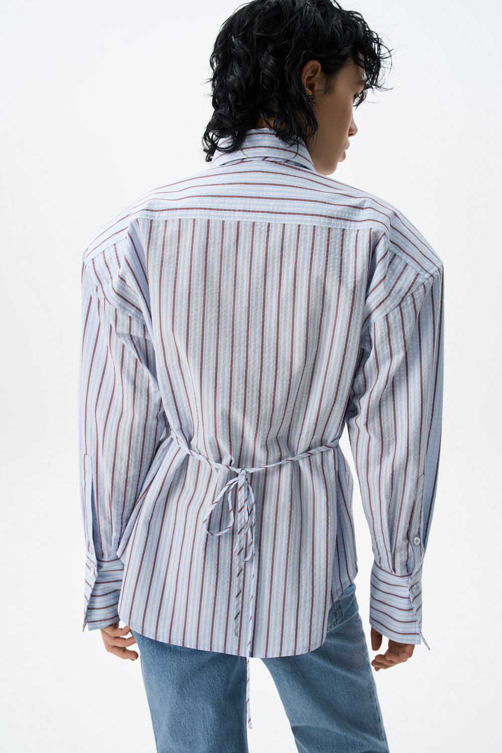 100% cotton shirt with tie. Straight-fit model with long sleeves with cuffs, a classic turn-down collar, shoulder pads and a tie at the back. Button fastening under the placket.